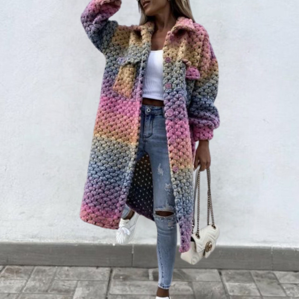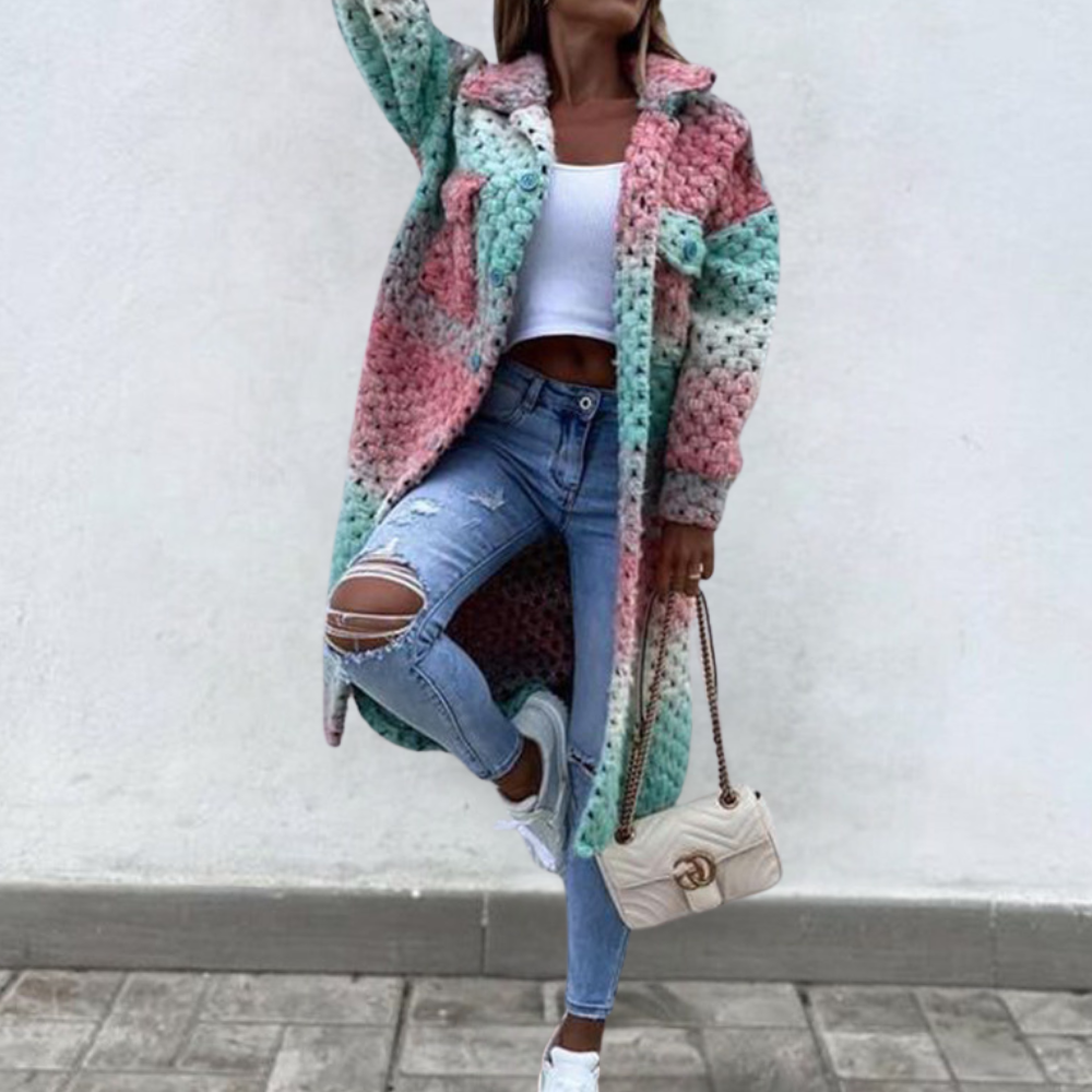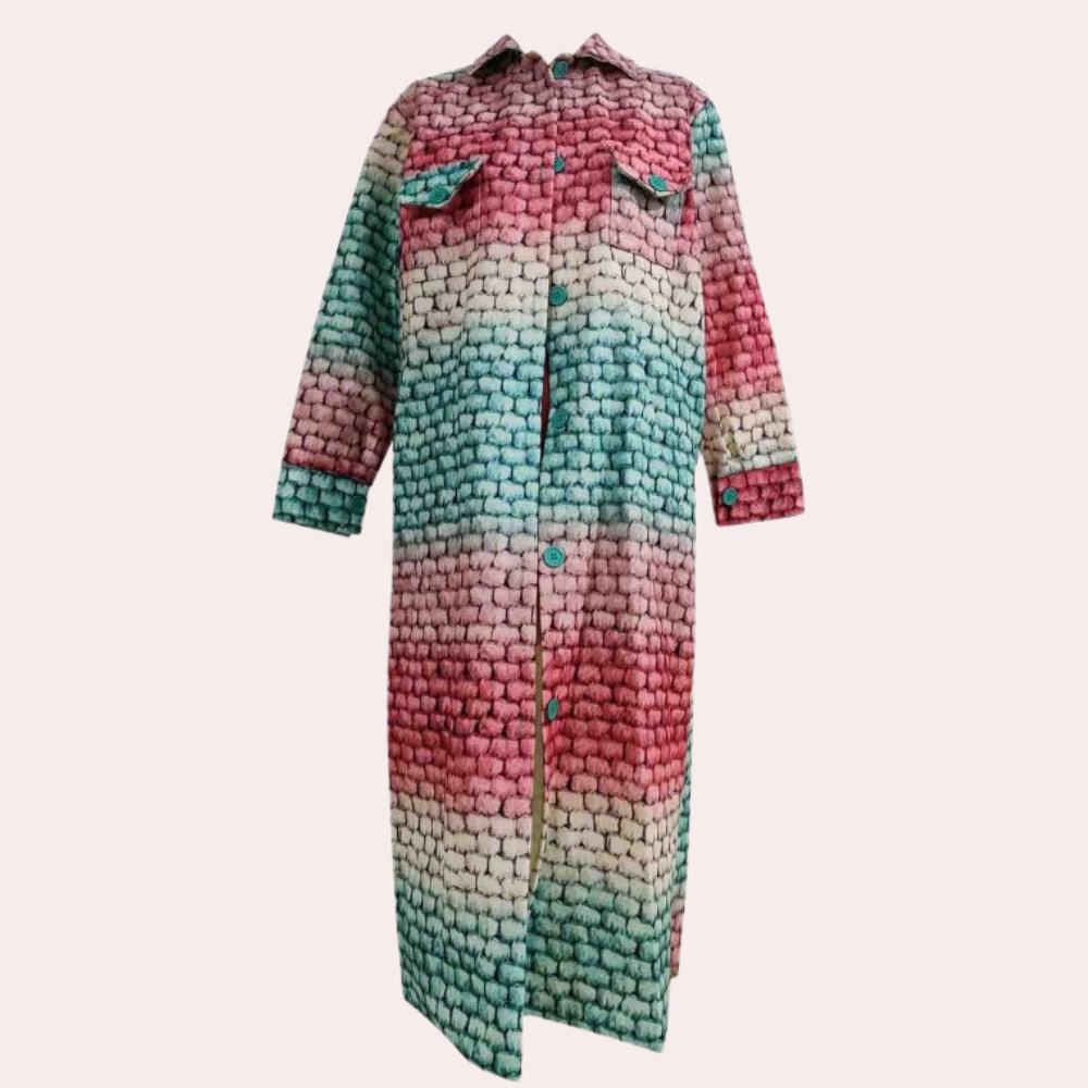Tilføj et strejf af farve og tekstur til vinteren med vores Farverigt Printet Flettet Twist Lang Vinterfrakke – et must-have til dig, der ønsker at gøre vintermode levende og unik.