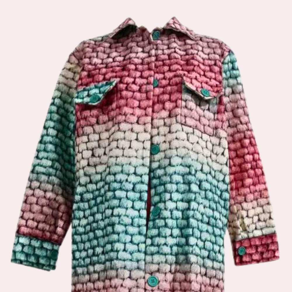 - Farverigt Print: Frakken er dækket af et levende, farverigt print, der tilføjer et unikt og iøjnefaldende element til vintergarderoben.