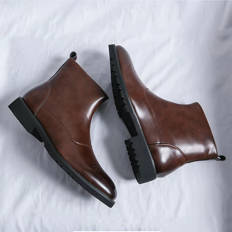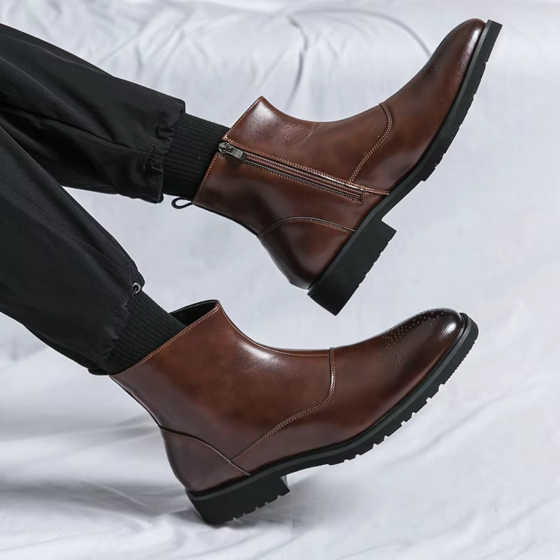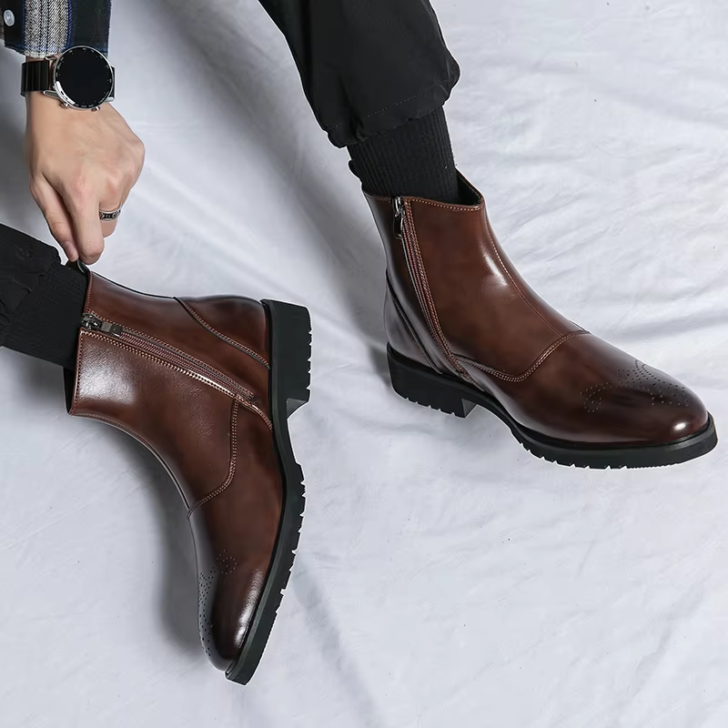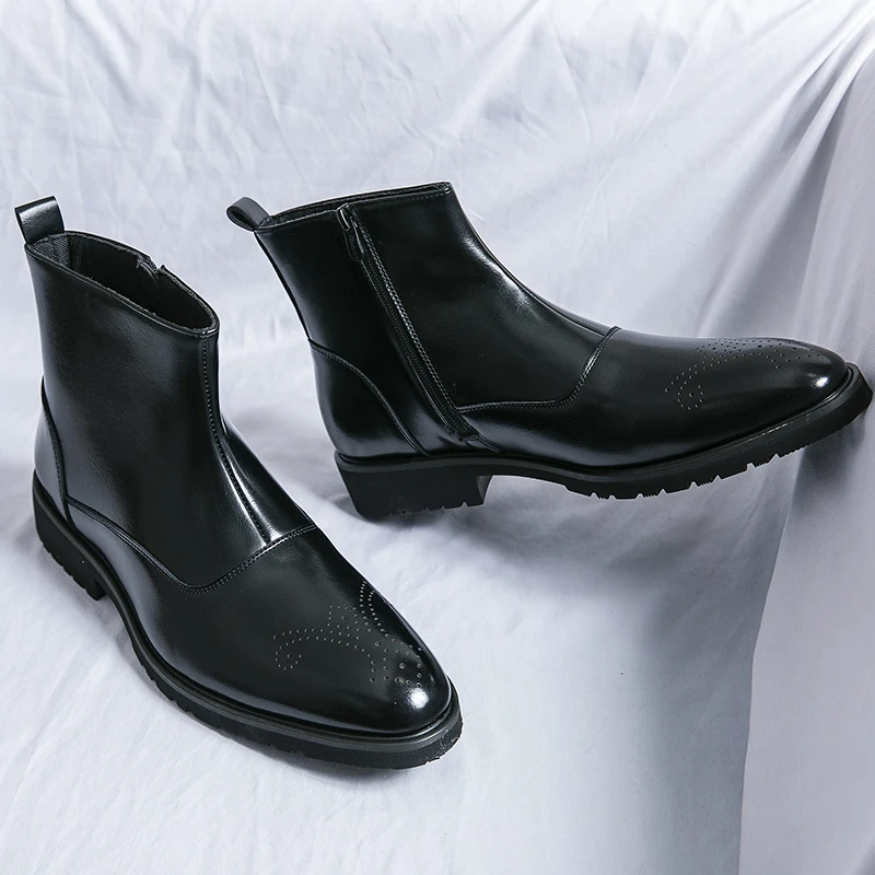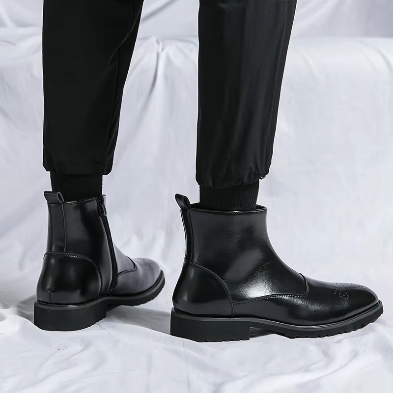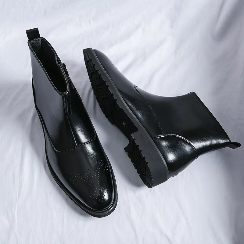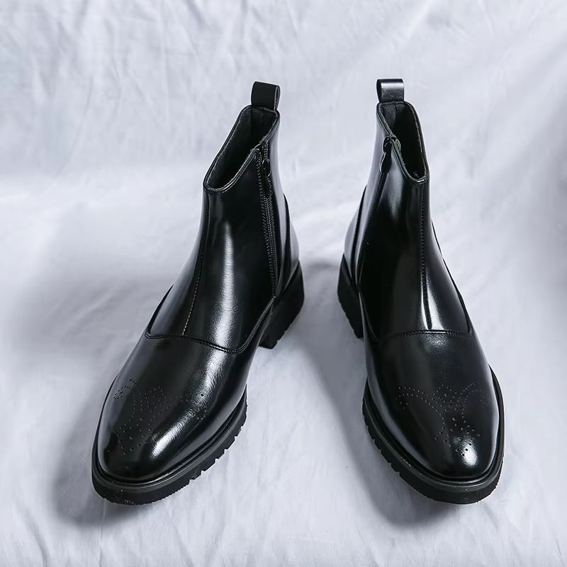 Fremstillet af læder i høj kvalitet, tilbyder støvlerne en luksuriøs finish og langvarig holdbarhed. Den robuste gummisål sikrer fremragende greb, selv på glatte overflader, mens lynlåsen i siden gør dem nemme at tage af og på. Det stilfulde perforeringsmønster på tåen tilføjer et strejf af elegance til designet, hvilket gør dem både praktiske og moderne.