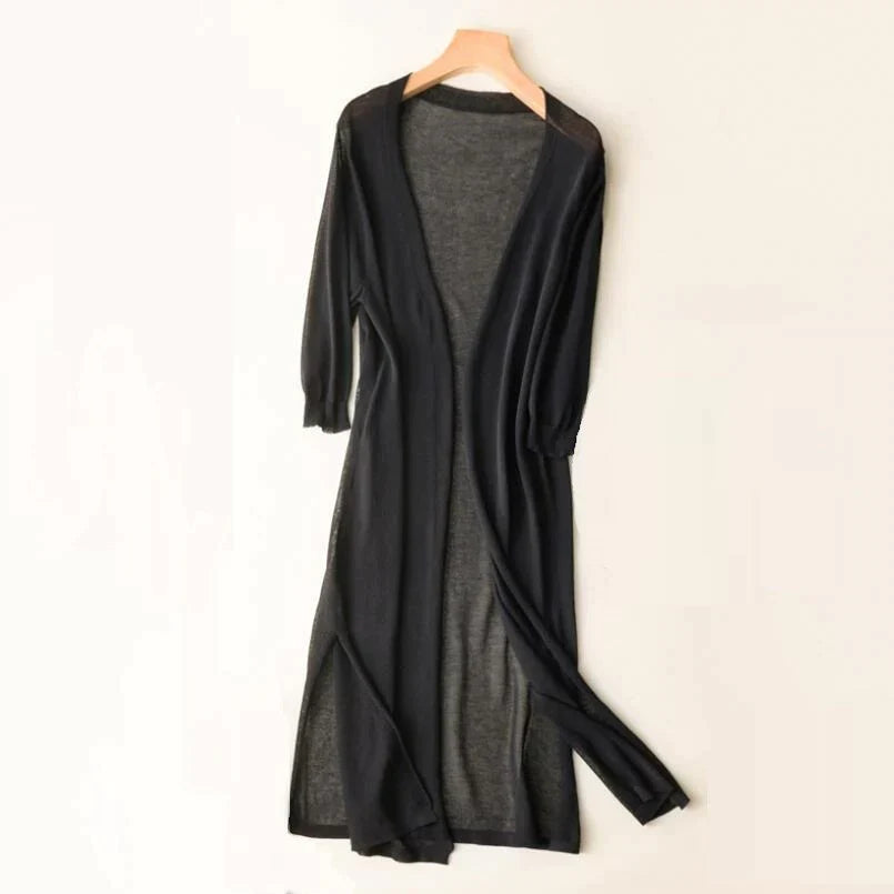 Tilføj et strejf af let elegance til din garderobe med vores Lange Cardigan med Letvægtsudhulning. Denne cardigan er designet til kvinder, der sætter pris på både komfort og stil. Med sit lette materiale og smukke udhulningsdetaljer er den perfekt til at skabe et sofistikeret look, uanset om du er på kontoret, på café, eller blot nyder en afslappet dag.