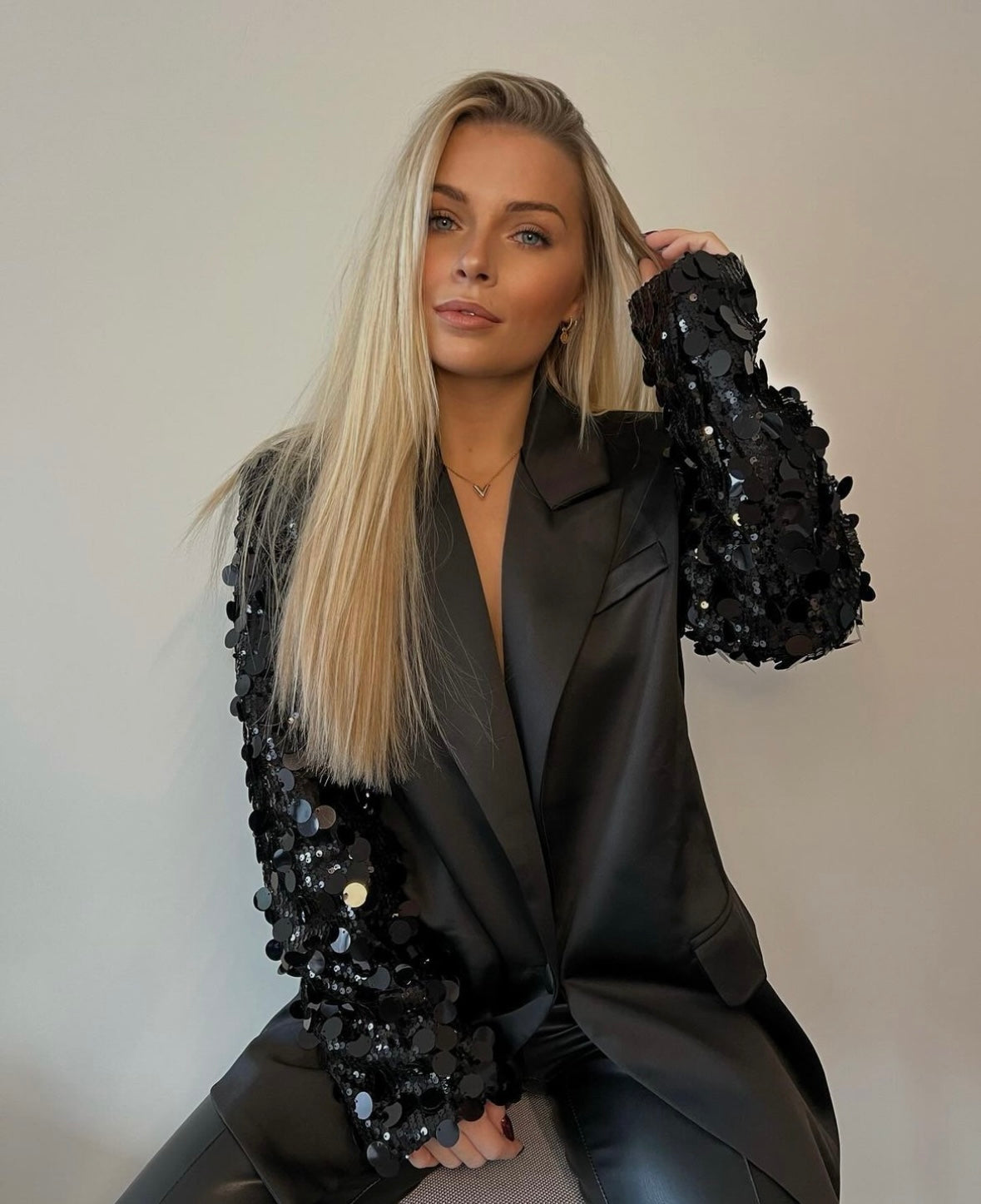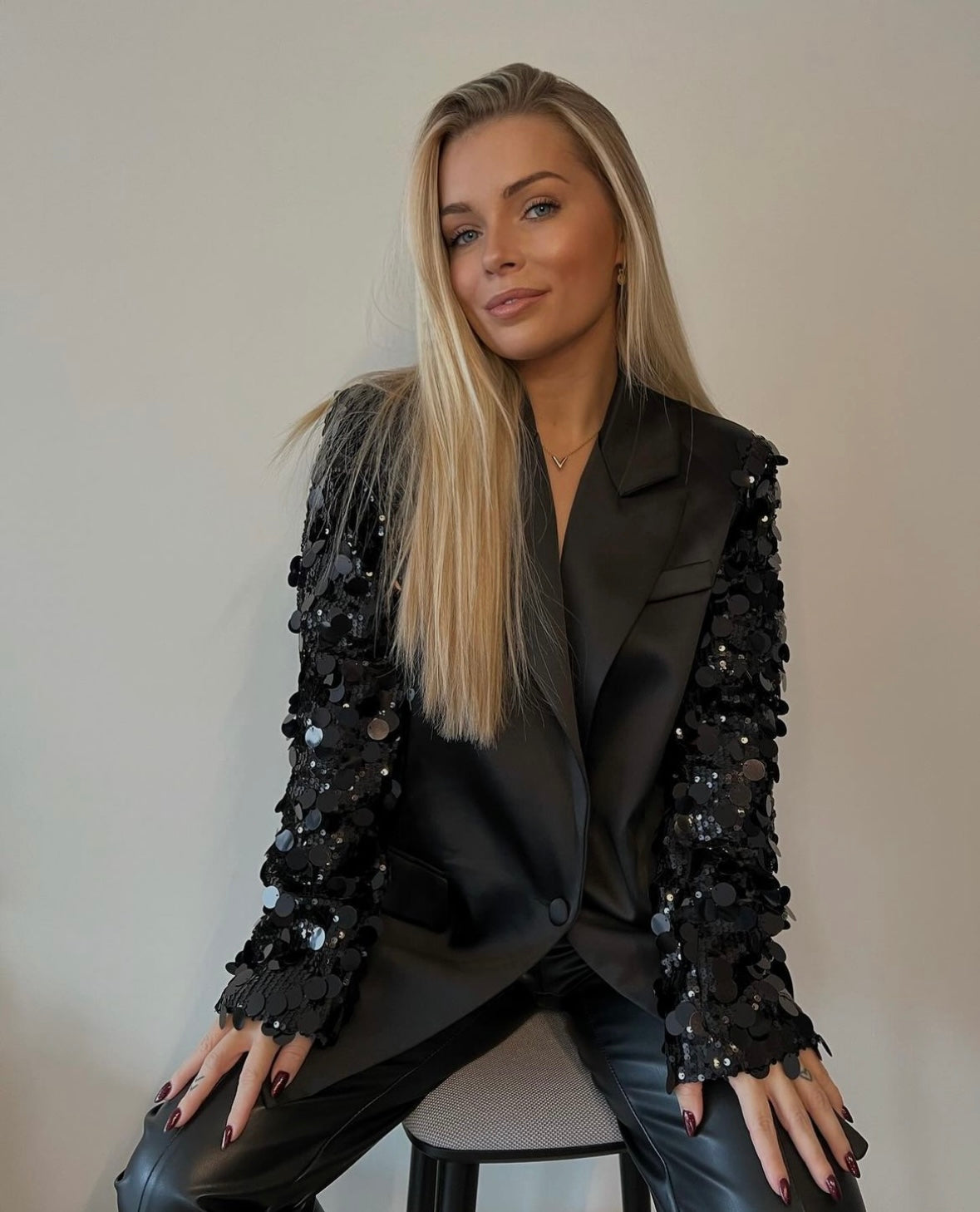 Uanset om du bevæger dig ind på klubscenen eller besøger byens mest populære nattelivssteder, lover dette ensemble at vende hoveder og sætte gang i samtalen. Omfavn nattens lokker med vores Glitter Blazer - det ultimative valg for dem, der ønsker at eje natten med stil!