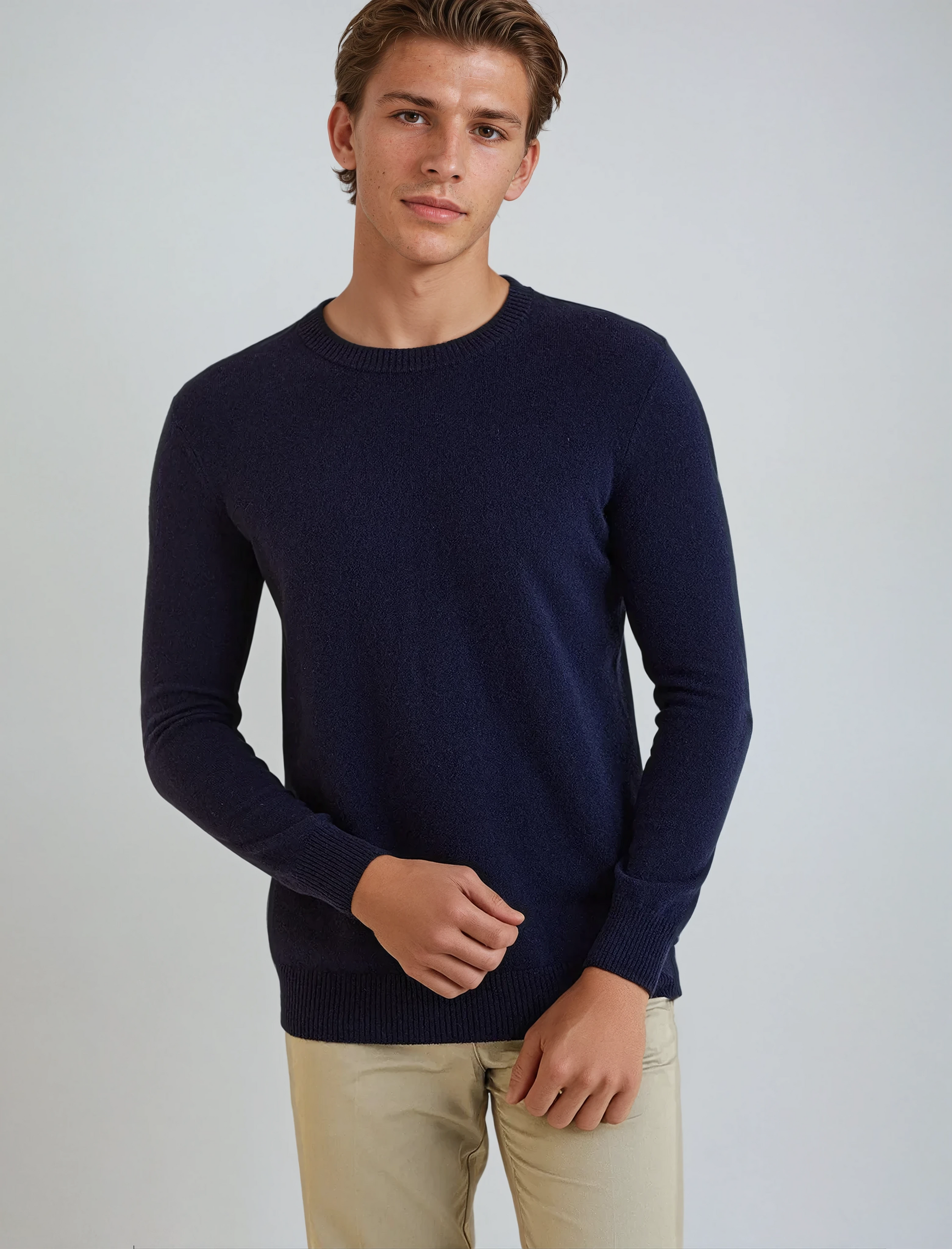 Vores marineblå signatur-sweater i kashmir kombinerer klassisk design med en dyb, sofistikeret farve og den uovertrufne blødhed fra 100% ren kashmir. Perfekt til manden, der ønsker både varme og et elegant look til både hverdag og mere formelle lejligheder.