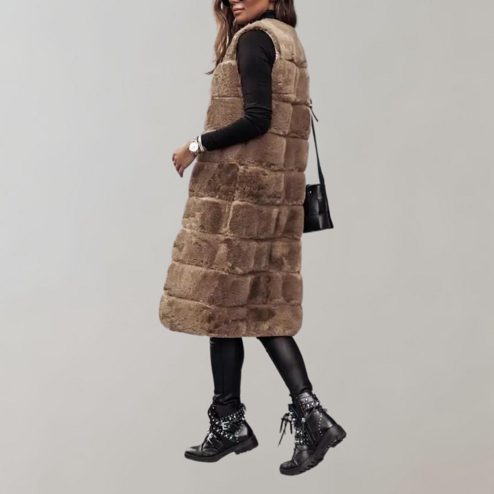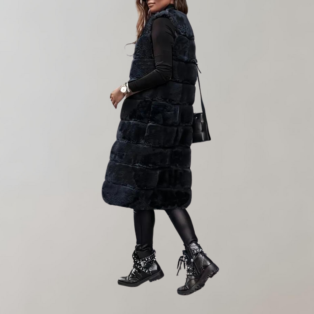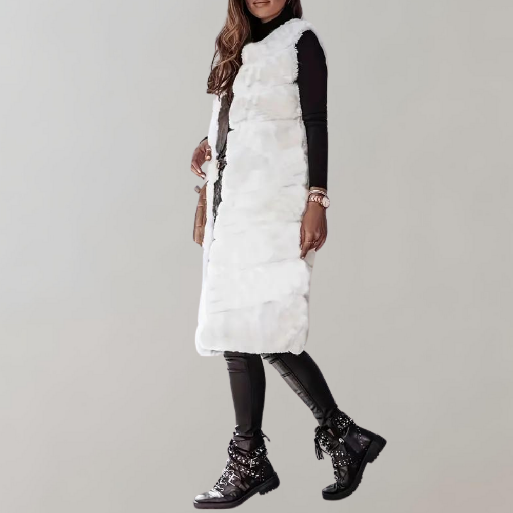 Med denne mellemlange pelsvest vil du føle dig både elegant og komfortabel. Det bløde pelsmateriale giver en luksuriøs fornemmelse, mens det lette design sikrer, at du nemt kan bevæge dig, uanset om du er på arbejde, ude med venner eller til en særlig begivenhed. Den mellemlange længde giver den perfekte balance mellem stil og funktionalitet.
