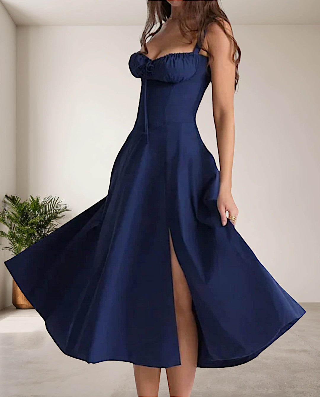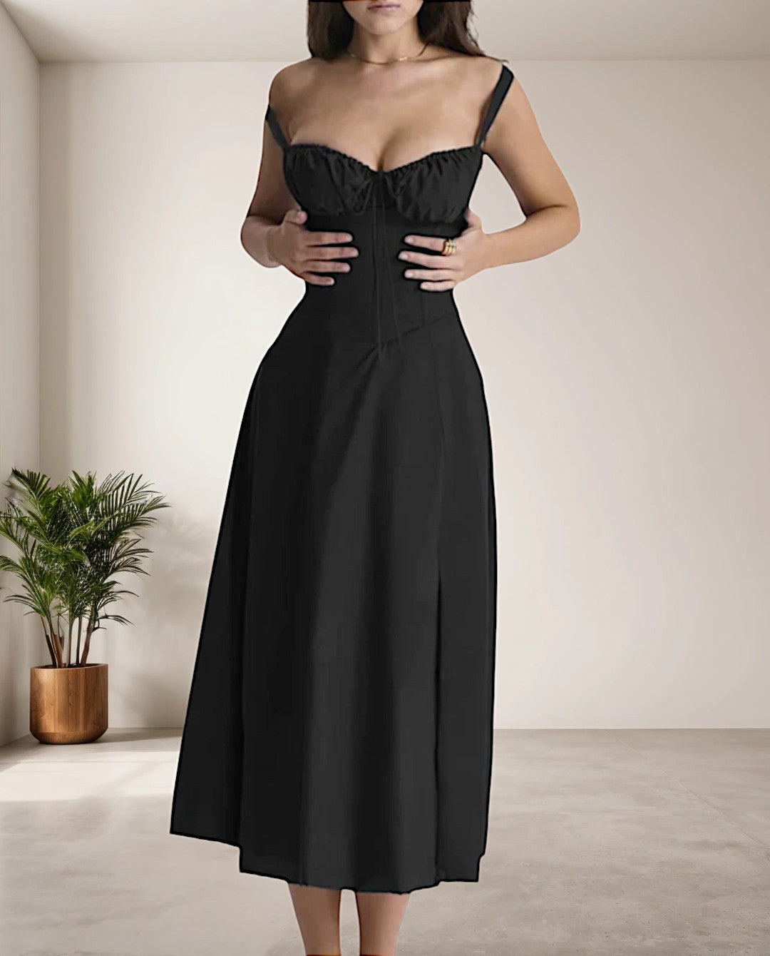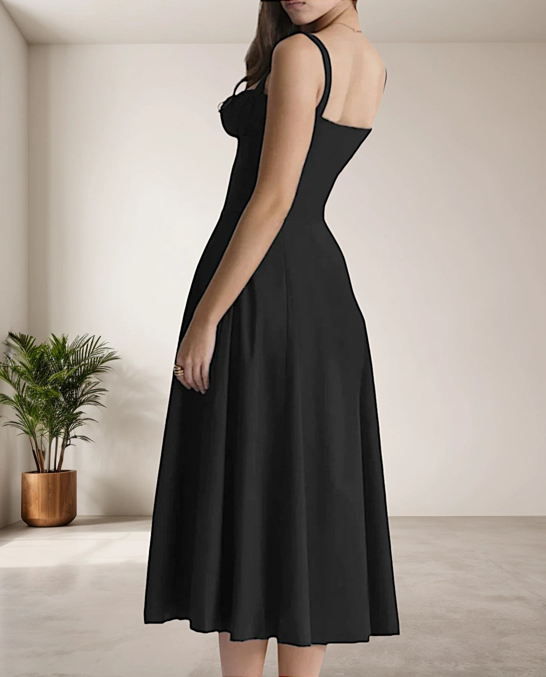 - Feminint udtryk: De fine spaghettistropper giver et elegant, feminint look, mens midi-længden tilføjer klassisk charme med et moderne twist.