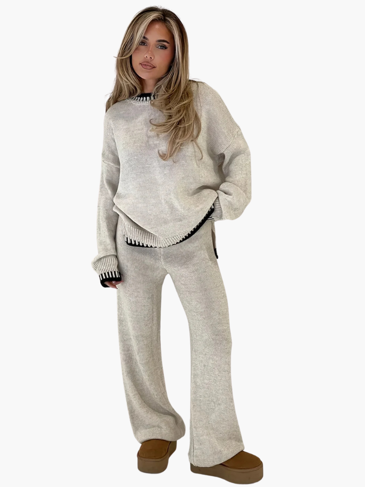 Perfekt til at holde dig varm og stilfuld på samme tid. Sættet består af en blød, strikket top og lange bukser, der er nemme at style med dine yndlings-Uggs eller sneakers for et ubesværet casual look. Uanset om du slapper af derhjemme eller skal ud, er dette det, du har brug for!