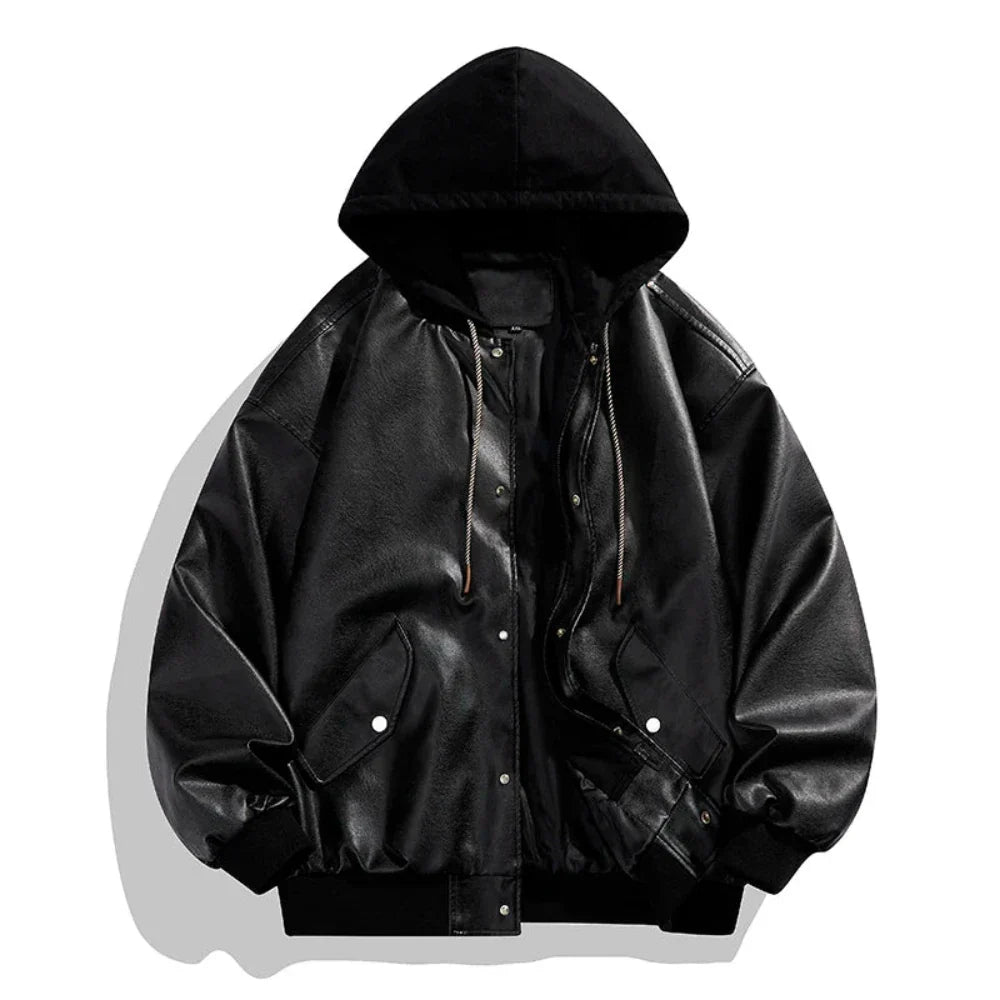 Denne jakke er den perfekte kombination af urbant look og praktisk design. Fremstillet af førsteklasses PU-læder, tilbyder denne bomberjakke med hætte et moderne, slankt udtryk og den holdbarhed, du har brug for til daglig brug. Den vandafvisende yderside holder dig tør under uventede regnbyger, mens den bløde indvendige foring giver komfort på kølige dage. Med en aftagelig hætte og trykknapper kan jakken let tilpasses fra afslappet til mere stilfuld, hvilket gør den egnet til enhver lejlighed.