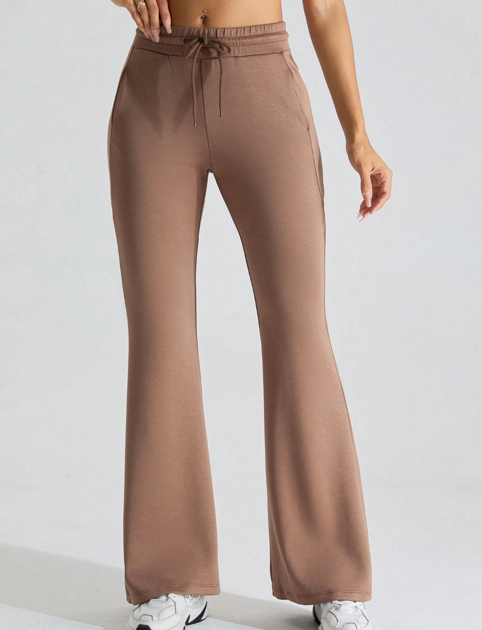 Disse stilfulde brune flared sportsbukser med snøre tilbyder den perfekte kombination af komfort og mode. Fremstillet af blødt, strækbart materiale for maksimal bevægelsesfrihed – ideelle til yoga eller afslappet brug.
