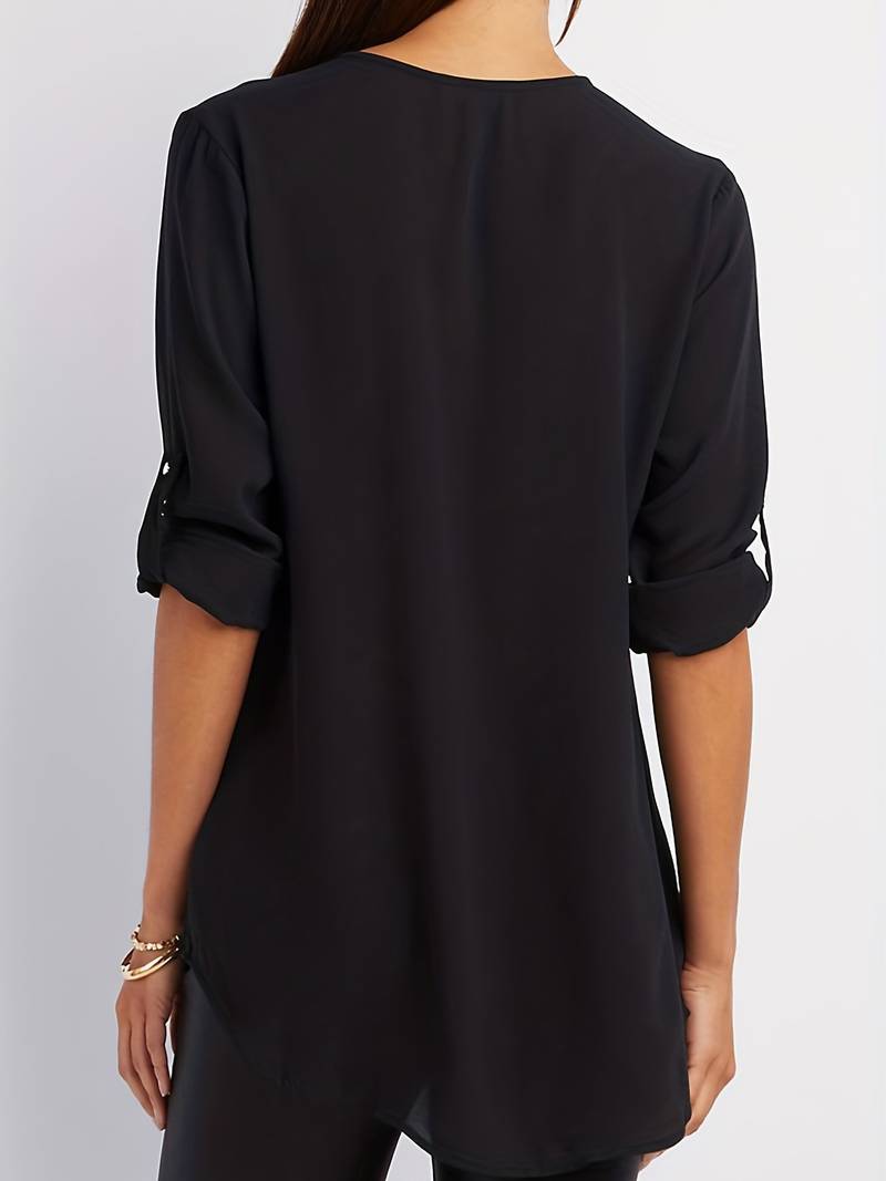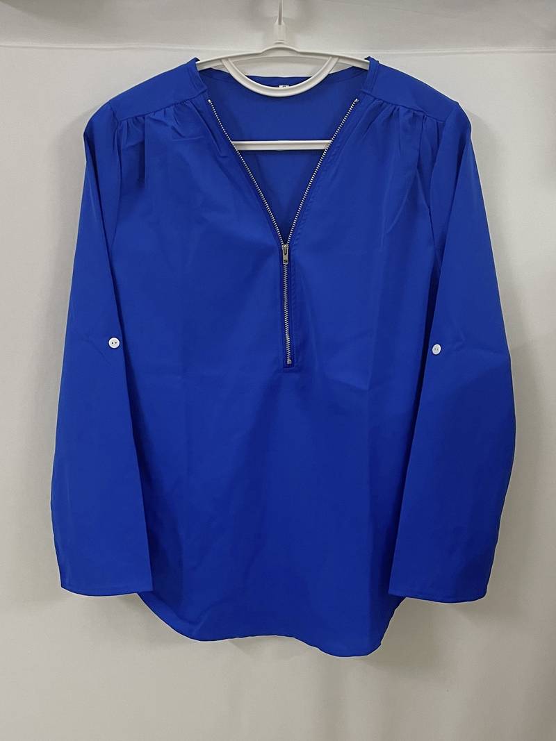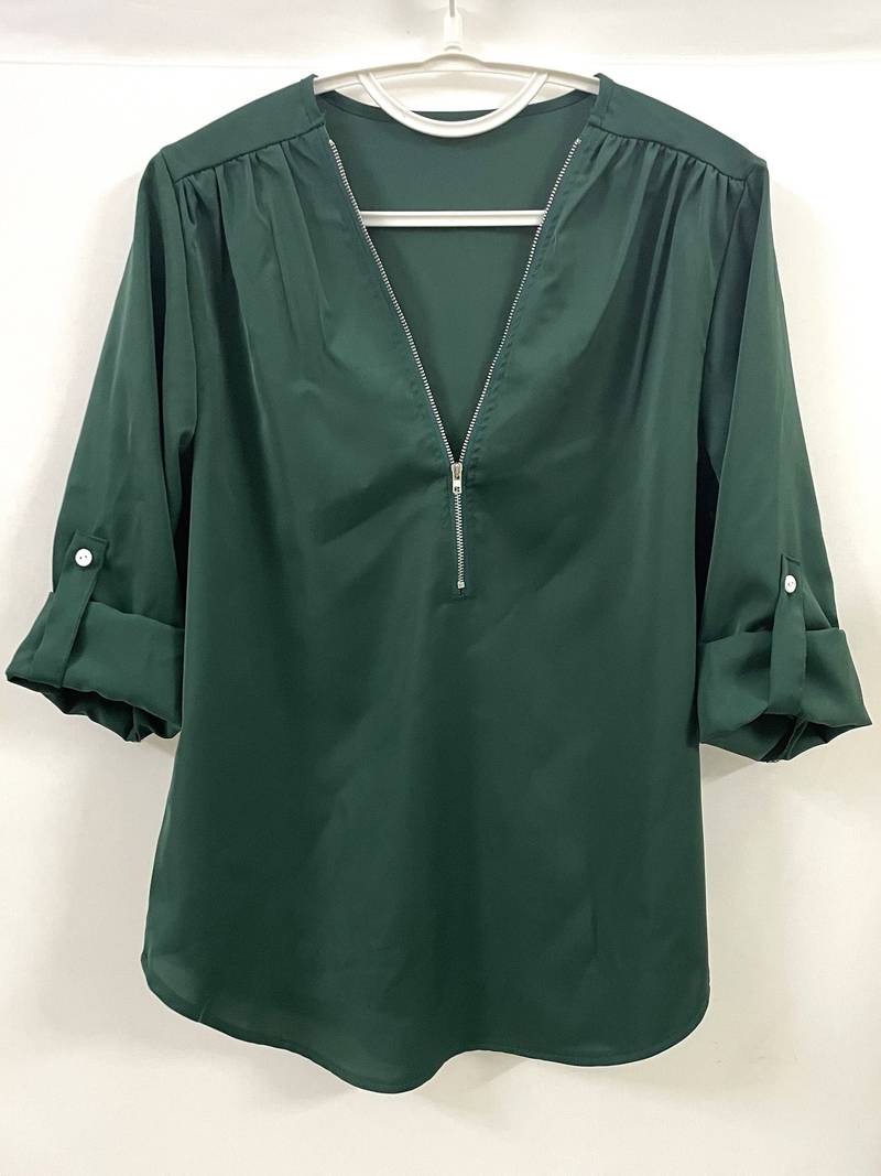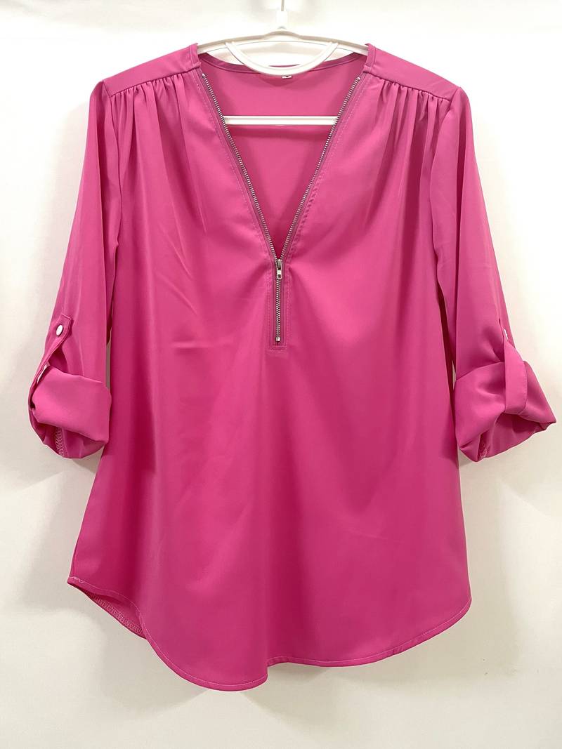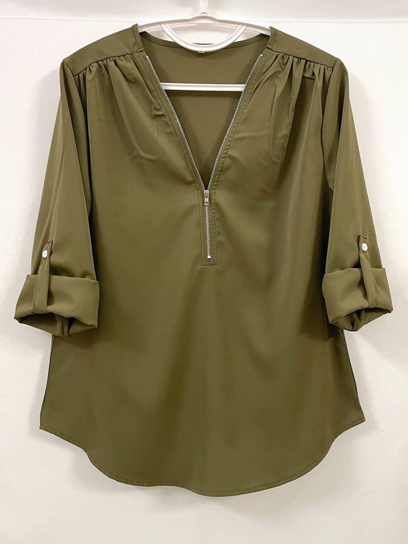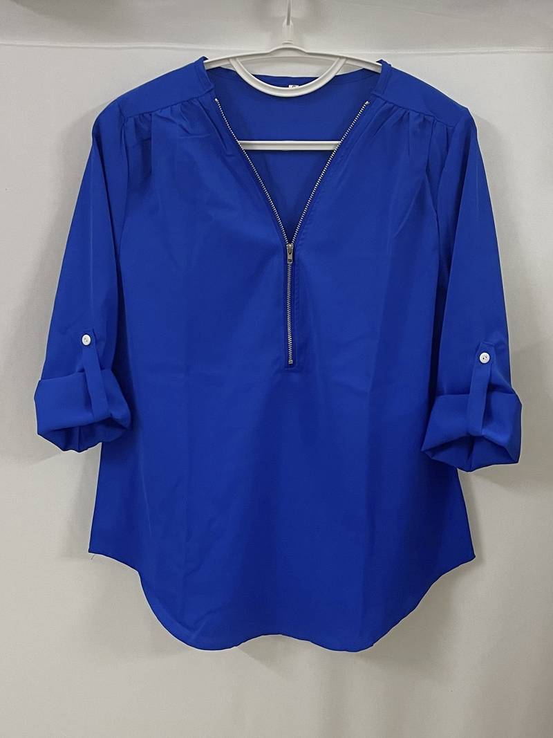 Opdater din hverdagsgarderobe med denne afslappede bluse, der har smukke flæsedetaljer, rulleærmer og en halvt lynlåsåbning ved halsen. Den er både stilfuld og alsidig, perfekt til enhver lejlighed, og kombinerer komfort med et strejf af elegance. Uanset om du er på farten eller mødes med venner, vil denne bluse tilføje et afslappet og elegant præg til dit look.