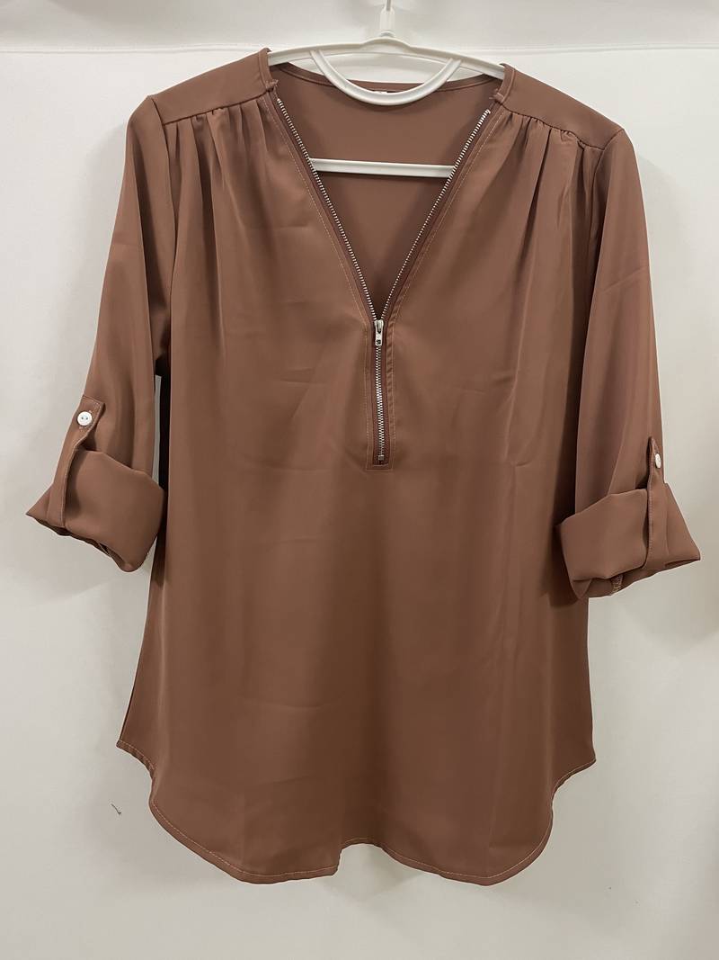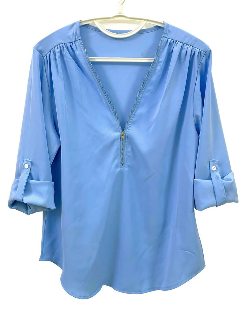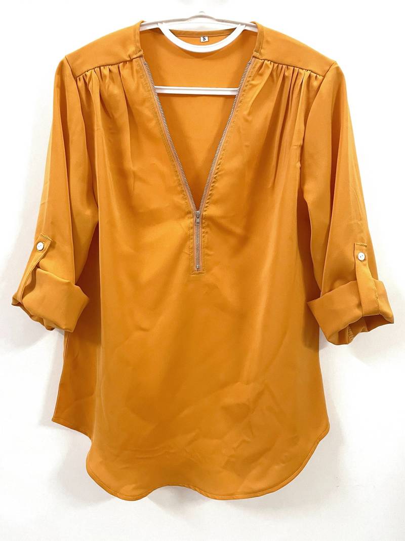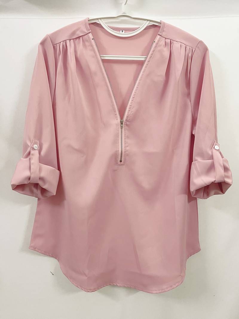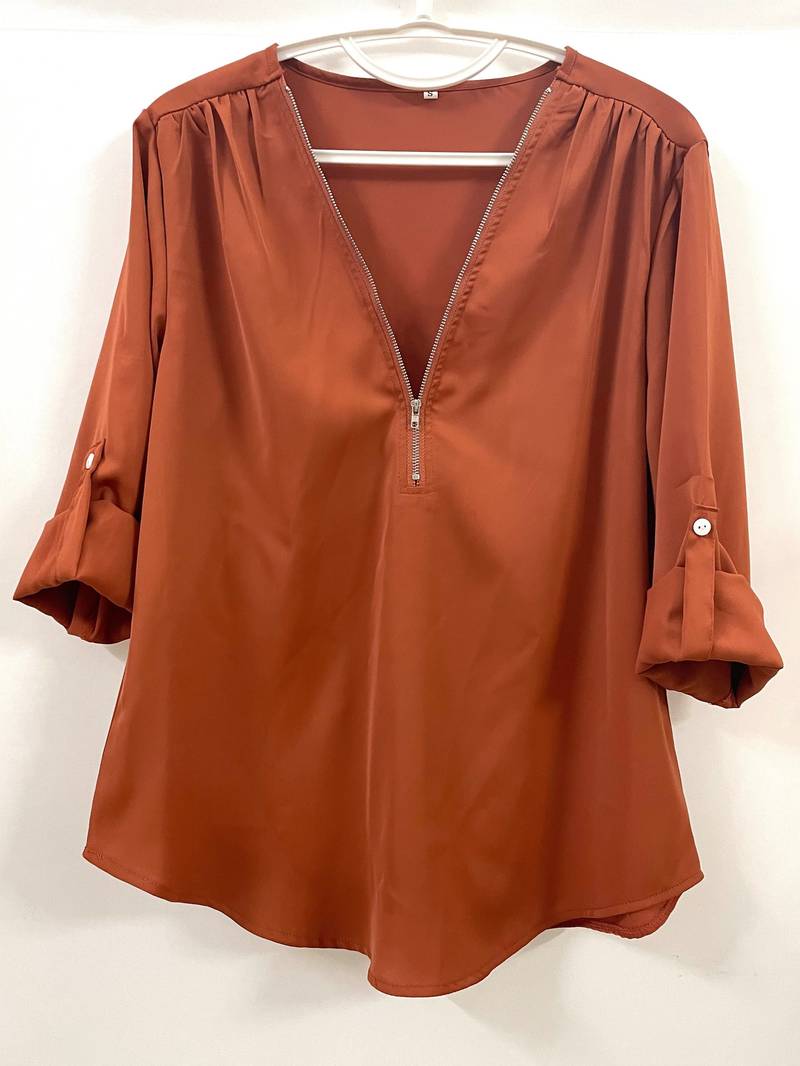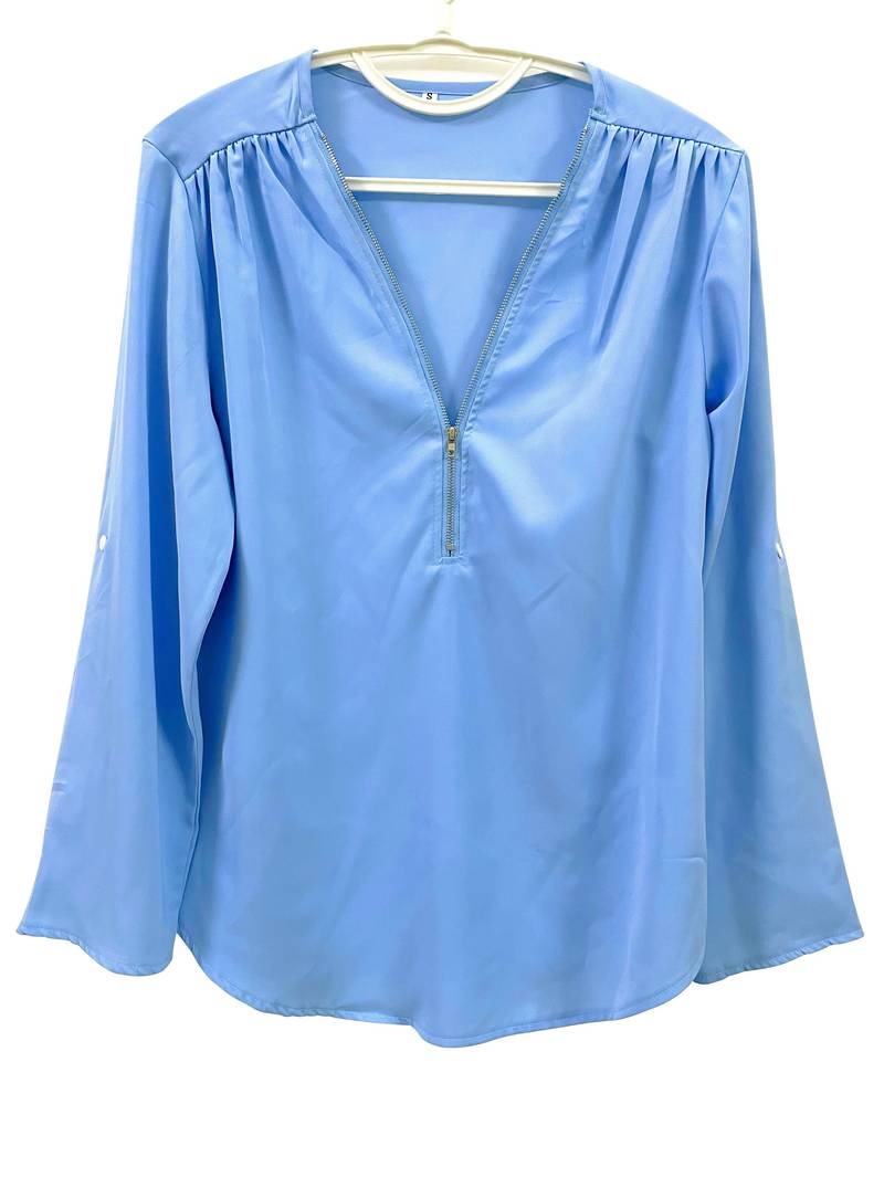 Opdater din hverdagsgarderobe med denne afslappede bluse, der har smukke flæsedetaljer, rulleærmer og en halvt lynlåsåbning ved halsen. Den er både stilfuld og alsidig, perfekt til enhver lejlighed, og kombinerer komfort med et strejf af elegance. Uanset om du er på farten eller mødes med venner, vil denne bluse tilføje et afslappet og elegant præg til dit look.
