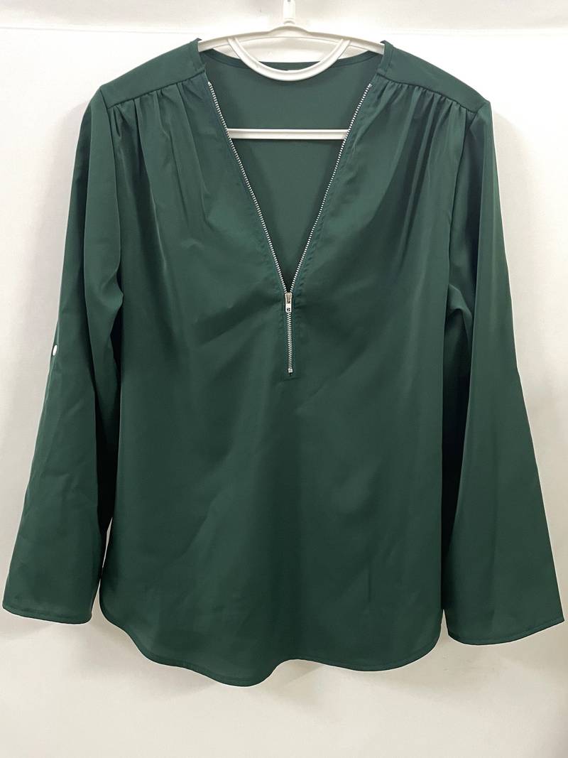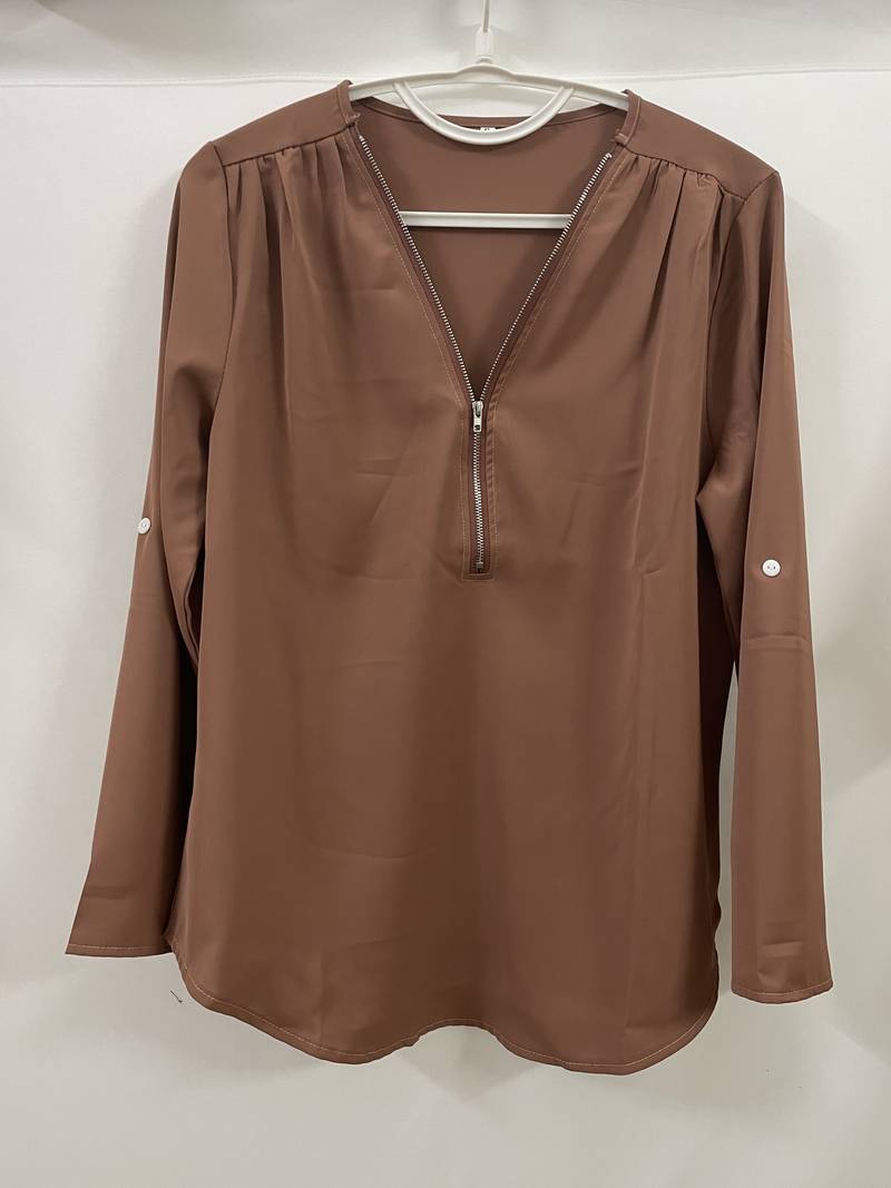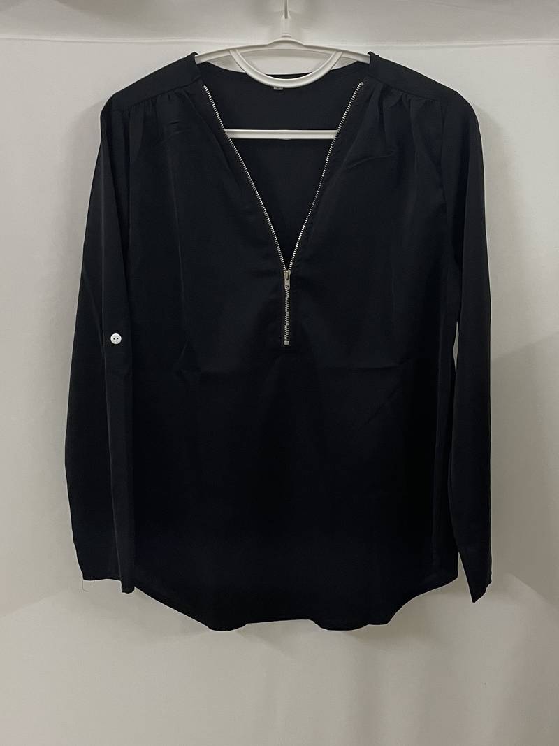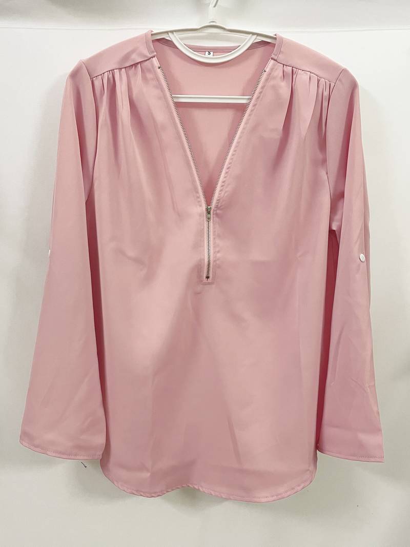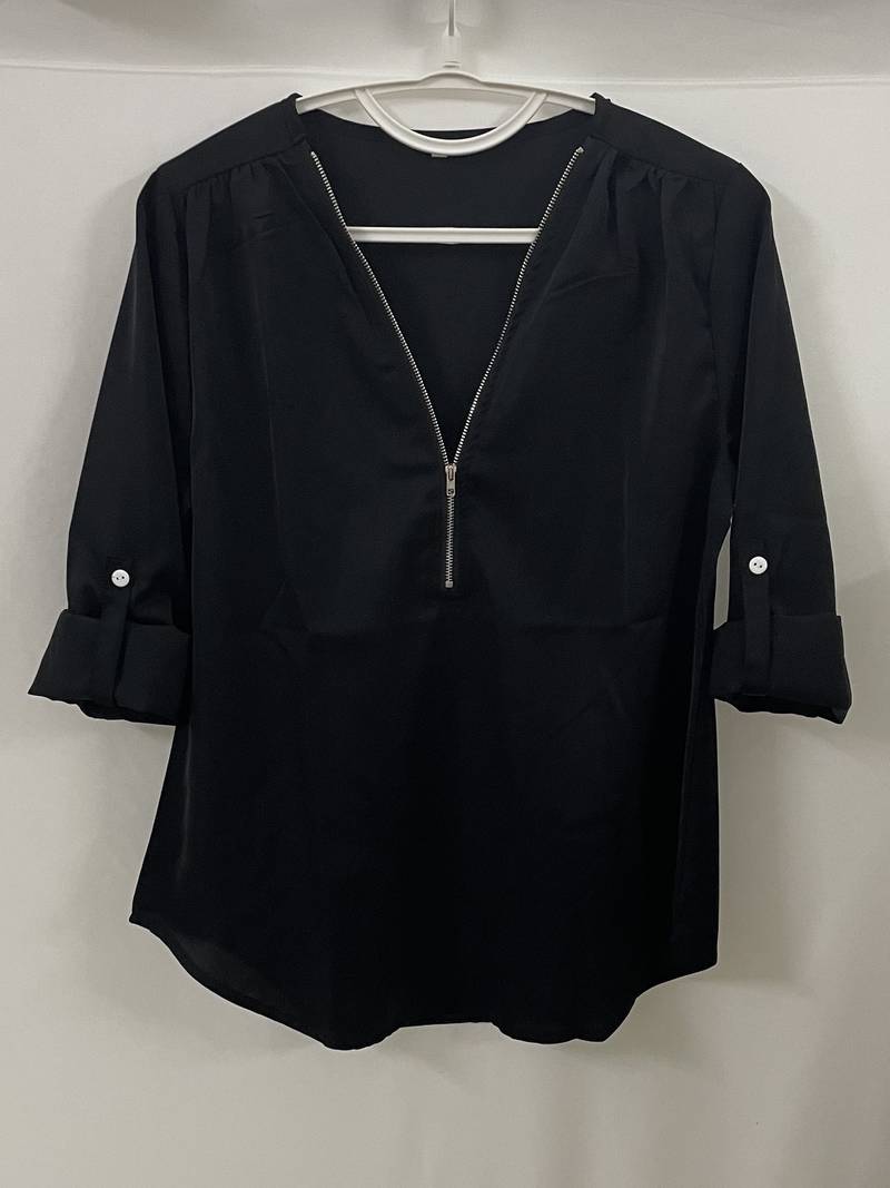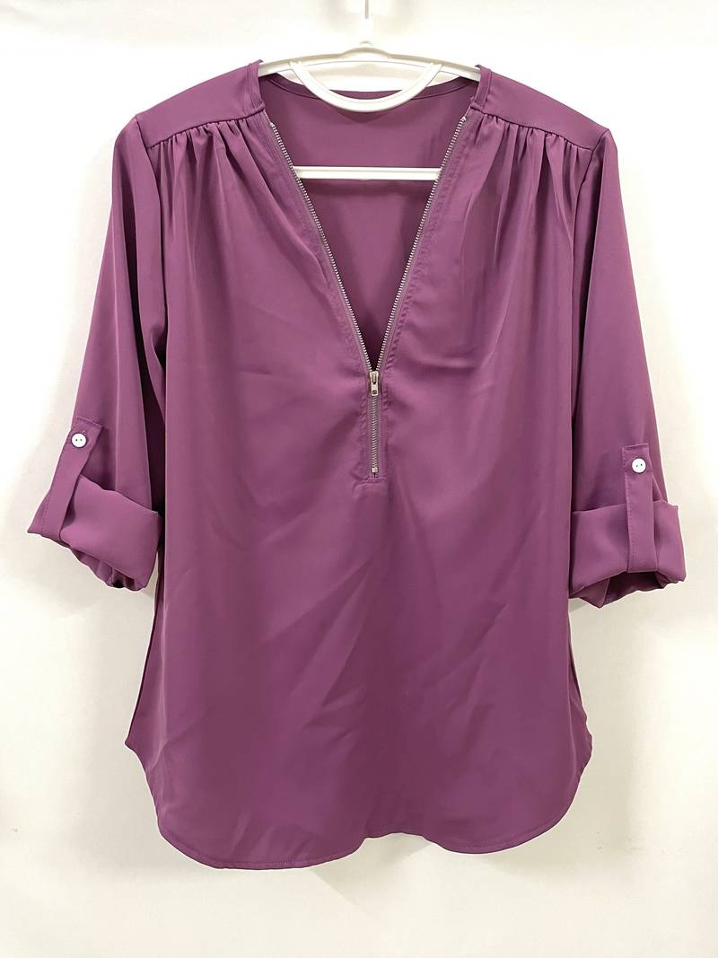 Opdater din hverdagsgarderobe med denne afslappede bluse, der har smukke flæsedetaljer, rulleærmer og en halvt lynlåsåbning ved halsen. Den er både stilfuld og alsidig, perfekt til enhver lejlighed, og kombinerer komfort med et strejf af elegance. Uanset om du er på farten eller mødes med venner, vil denne bluse tilføje et afslappet og elegant præg til dit look.