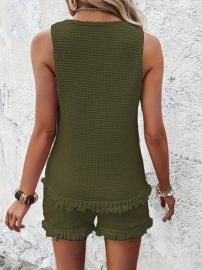 Dette sæt imponerer med en elegant, ærmeløs pullover-top og stilfulde blonde-shorts. Perfekt til chikke anledninger og trendbevidste kvinder kombinerer det høj komfort med et moderne og feminint udtryk. Fremstillet af materialer i høj kvalitet tilbyder dette sæt en elegant og sofistikeret stil.
