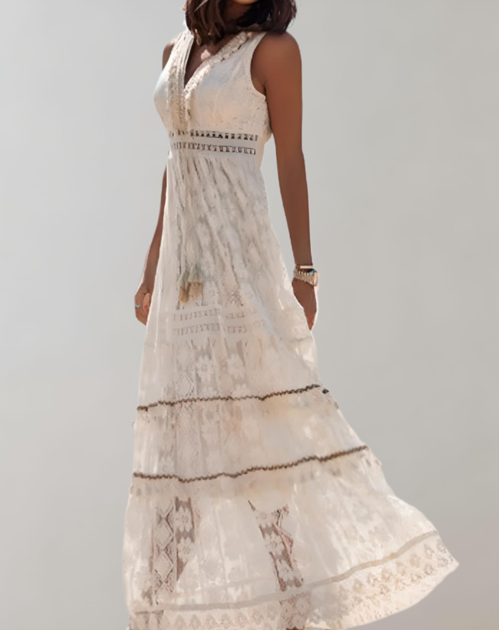 Lad din naturlige skønhed skinne igennem med vores Elegant Bohemian Maxi-Kjole med Blonde. Denne ærmeløse bohemian-inspirerede kjole med en sofistikeret V-hals og delikate blondedetaljer kombinerer komfort og stil, perfekt til enhver sommerdag eller -aften.