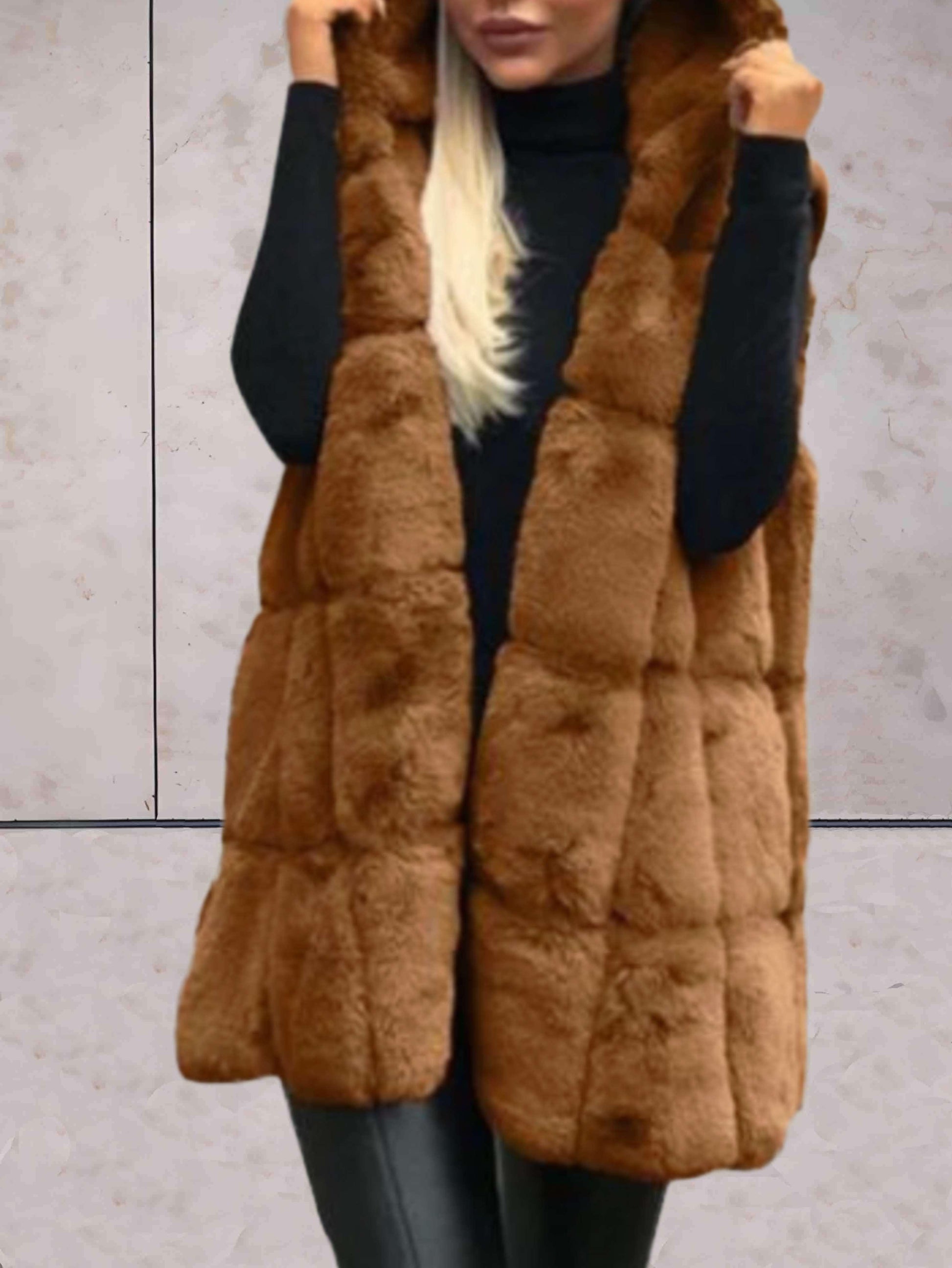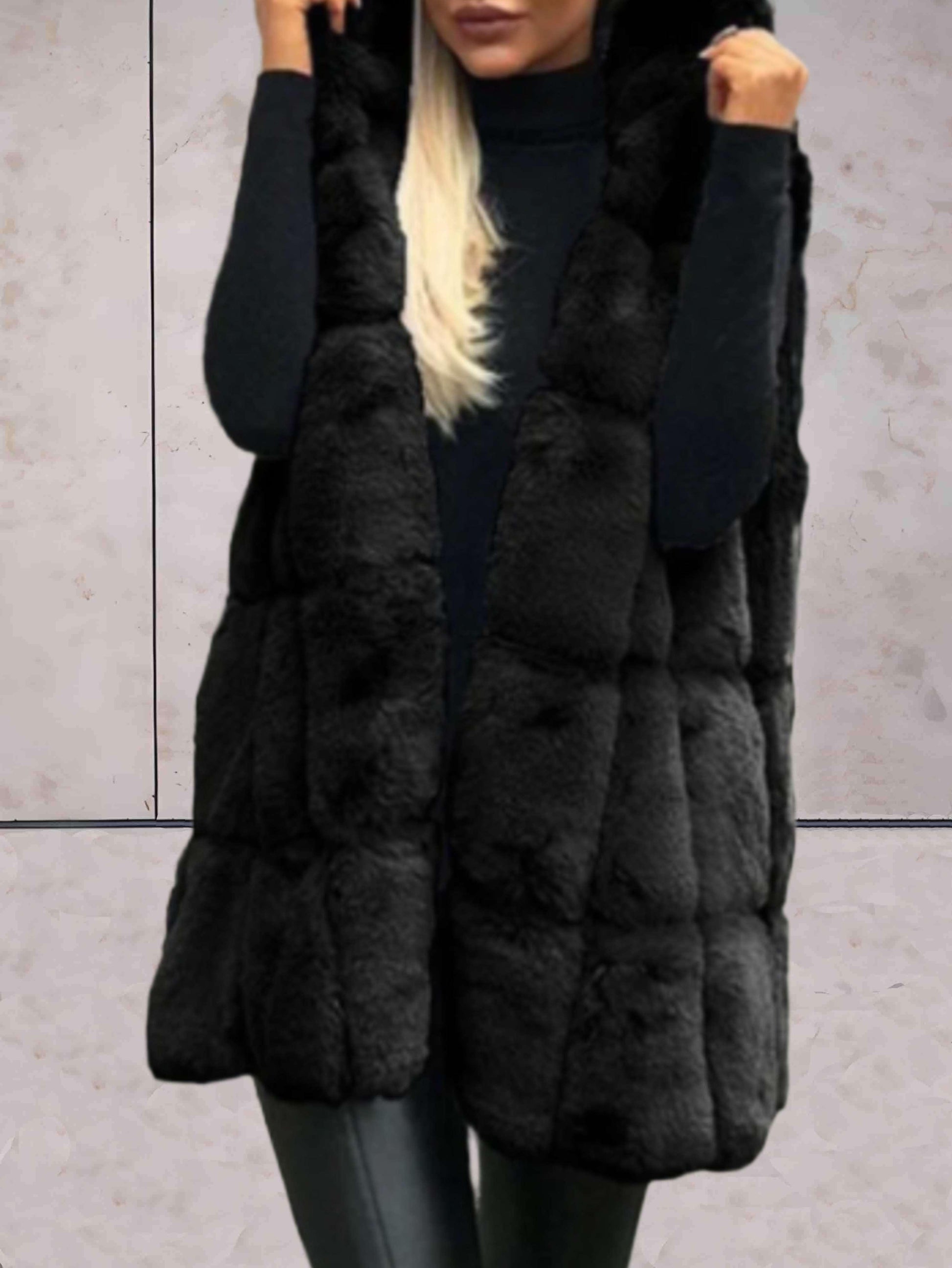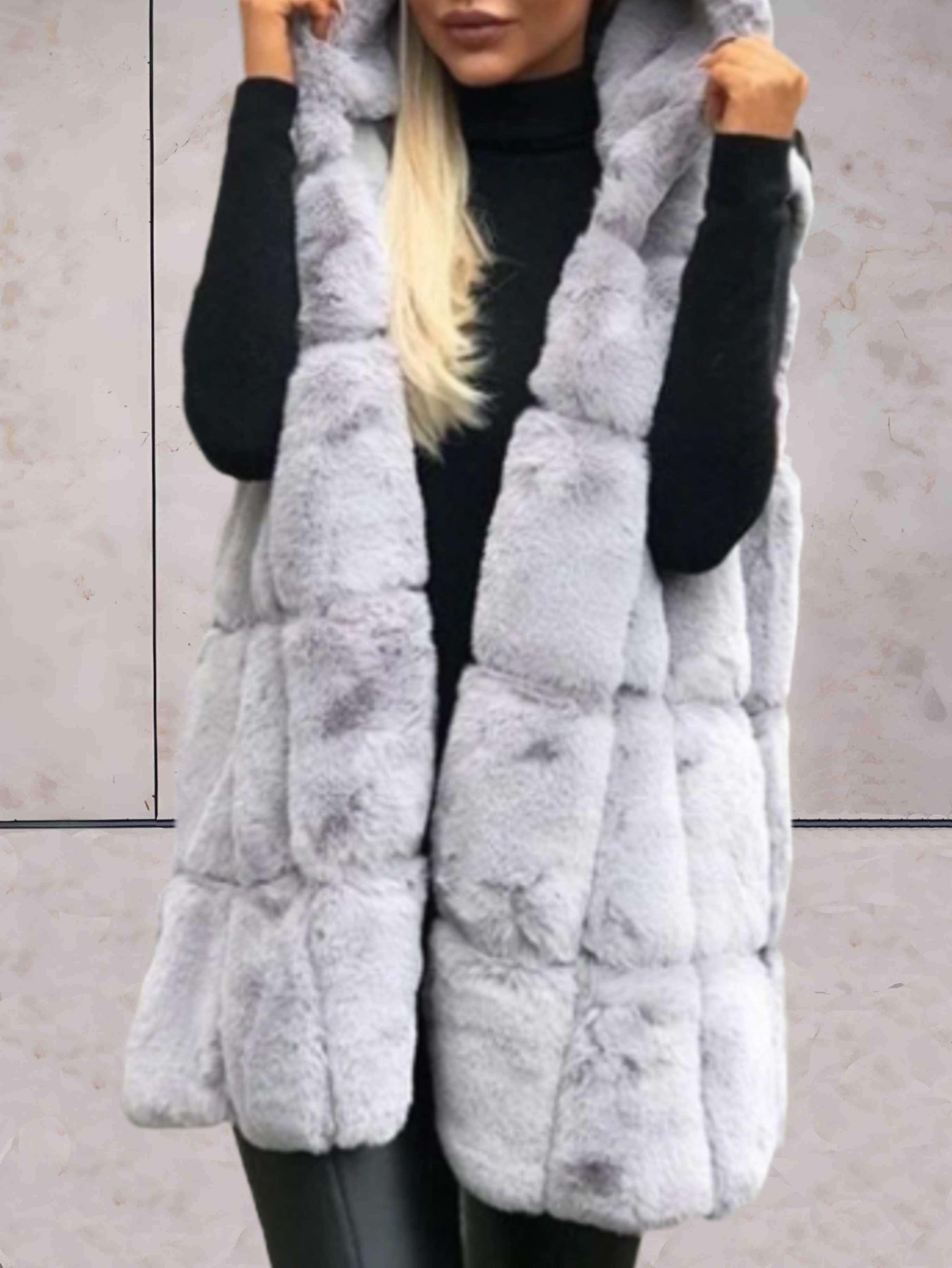 Fluffy ærmeløs pelsfrakke med hætte til kvinder