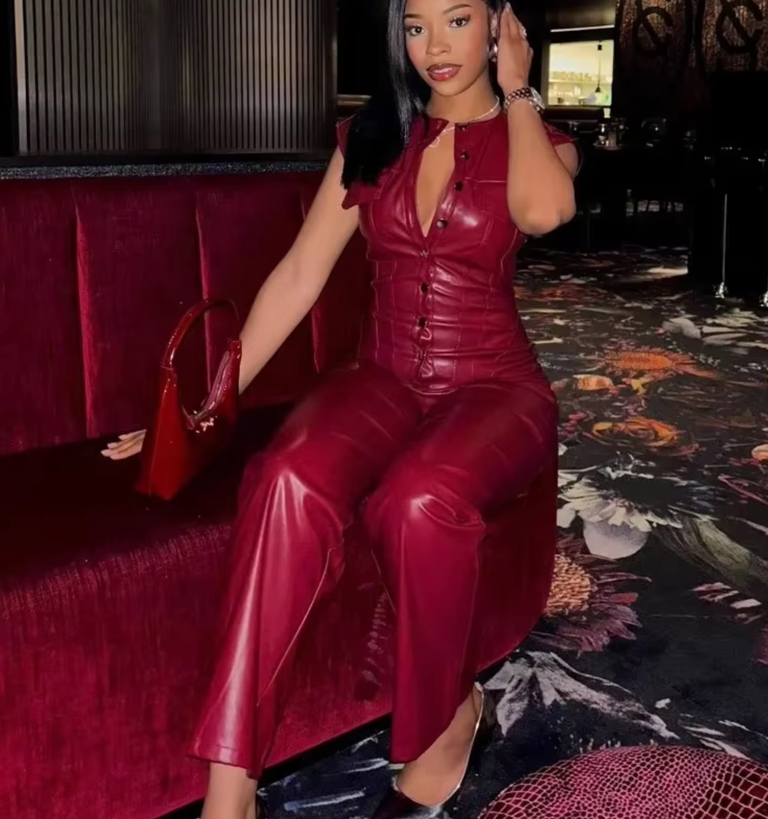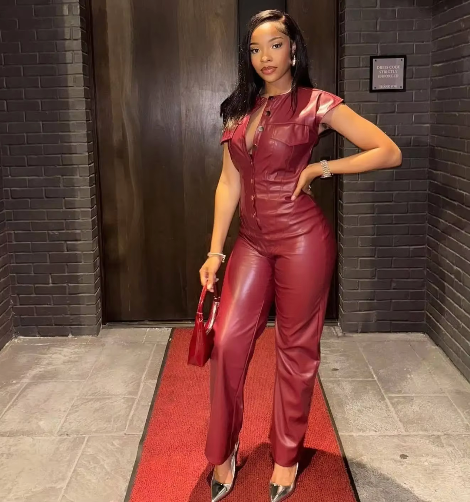 Denne jumpsuit er fremstillet af kvalitetslæder og kombinerer elegance med et edgy look. Designet inkluderer stilfulde flæsedetaljer og en taljeskåret pasform, der fremhæver dine kurver, mens de funktionelle cargolommer tilføjer et strejf af streetwear-inspireret praktikalitet.