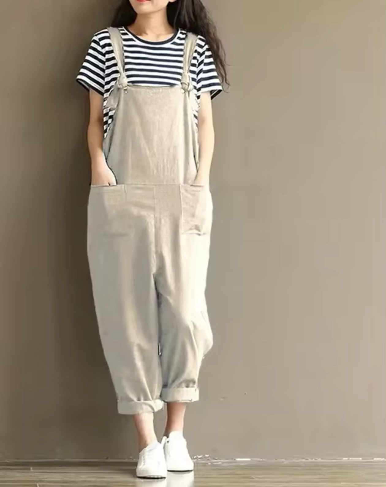 Denne ensfarvede overall er fremstillet af børstet bomuld, der giver en blød og åndbar tekstur, skånsom mod huden. Med en løs og afslappet pasform, justerbare stropper og rummelige lommer kombinerer den stil og funktionalitet, hvilket gør den ideel til hverdagsbrug eller pendling.