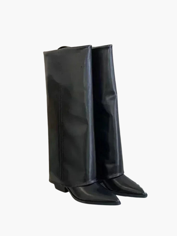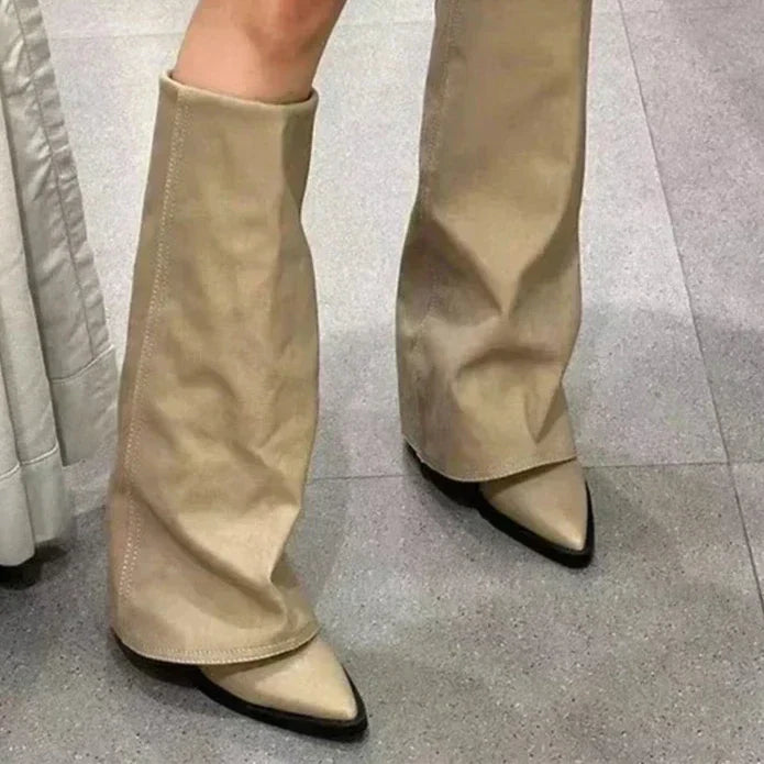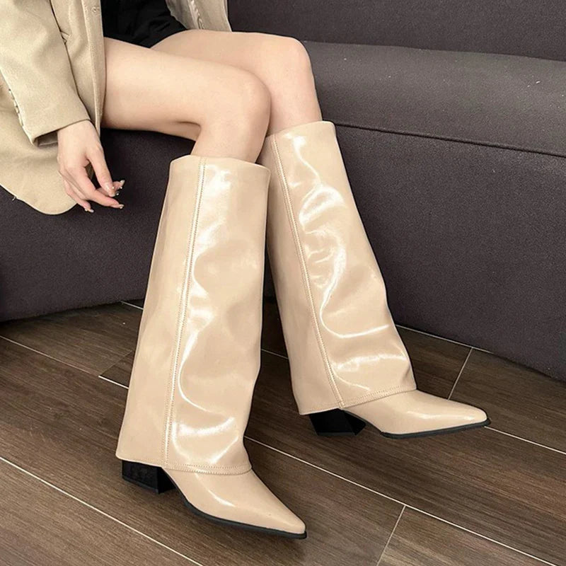 Knæhøje støvler med spids snude og blokhæl til kvinder