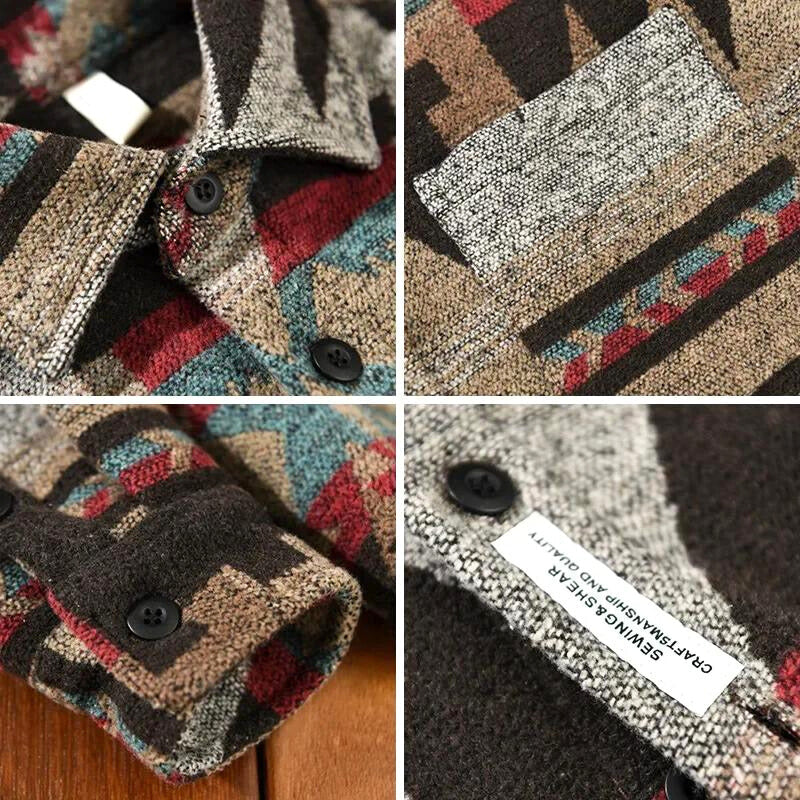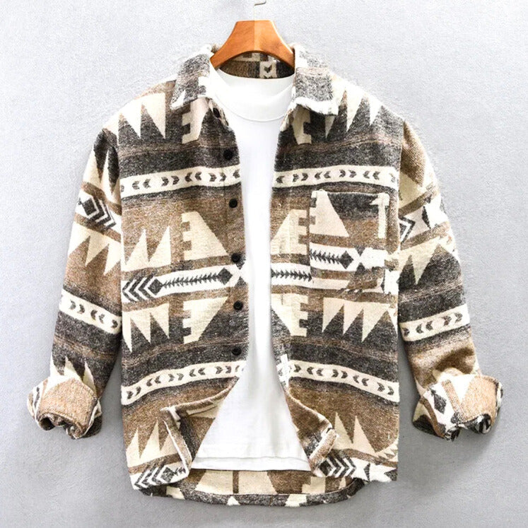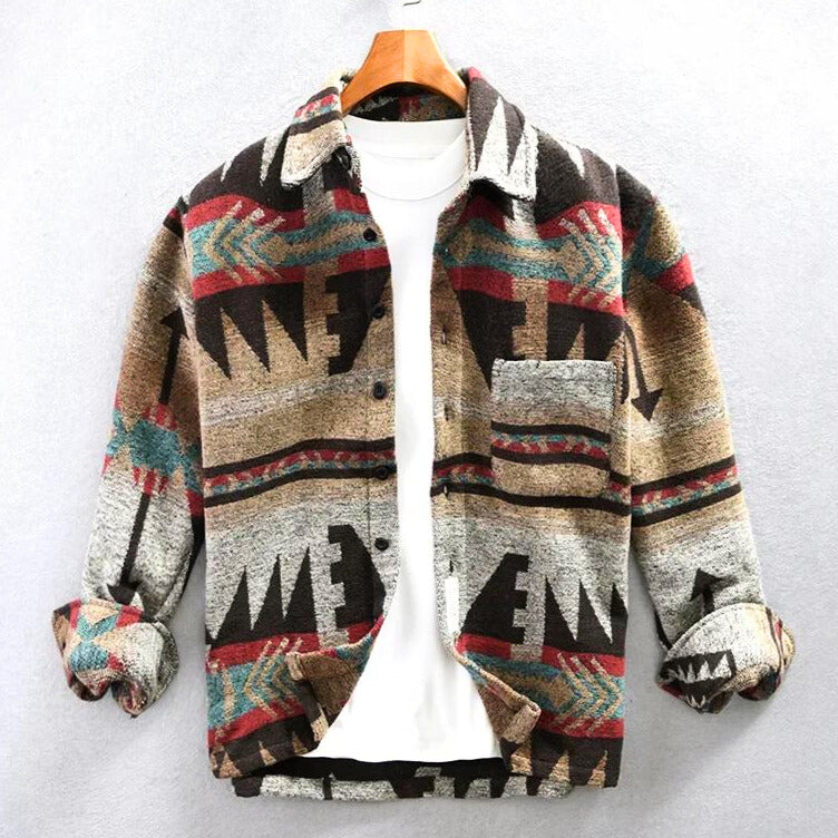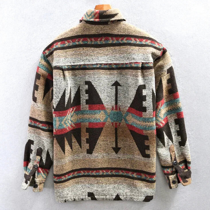 Unikt og iøjnefaldende design: De geometriske mønstre gør denne jakke til noget helt særligt. Det unikke design tilføjer ikke blot karakter til dit outfit, men fungerer også som en samtalestarter, der viser din interesse for kultur og stil.