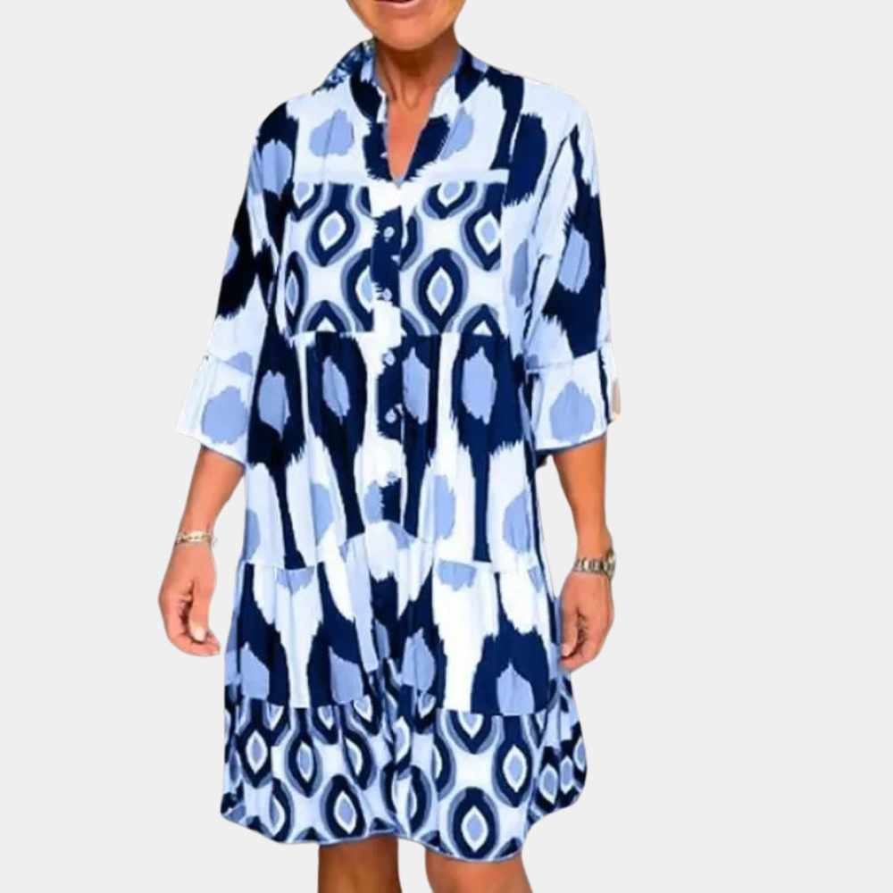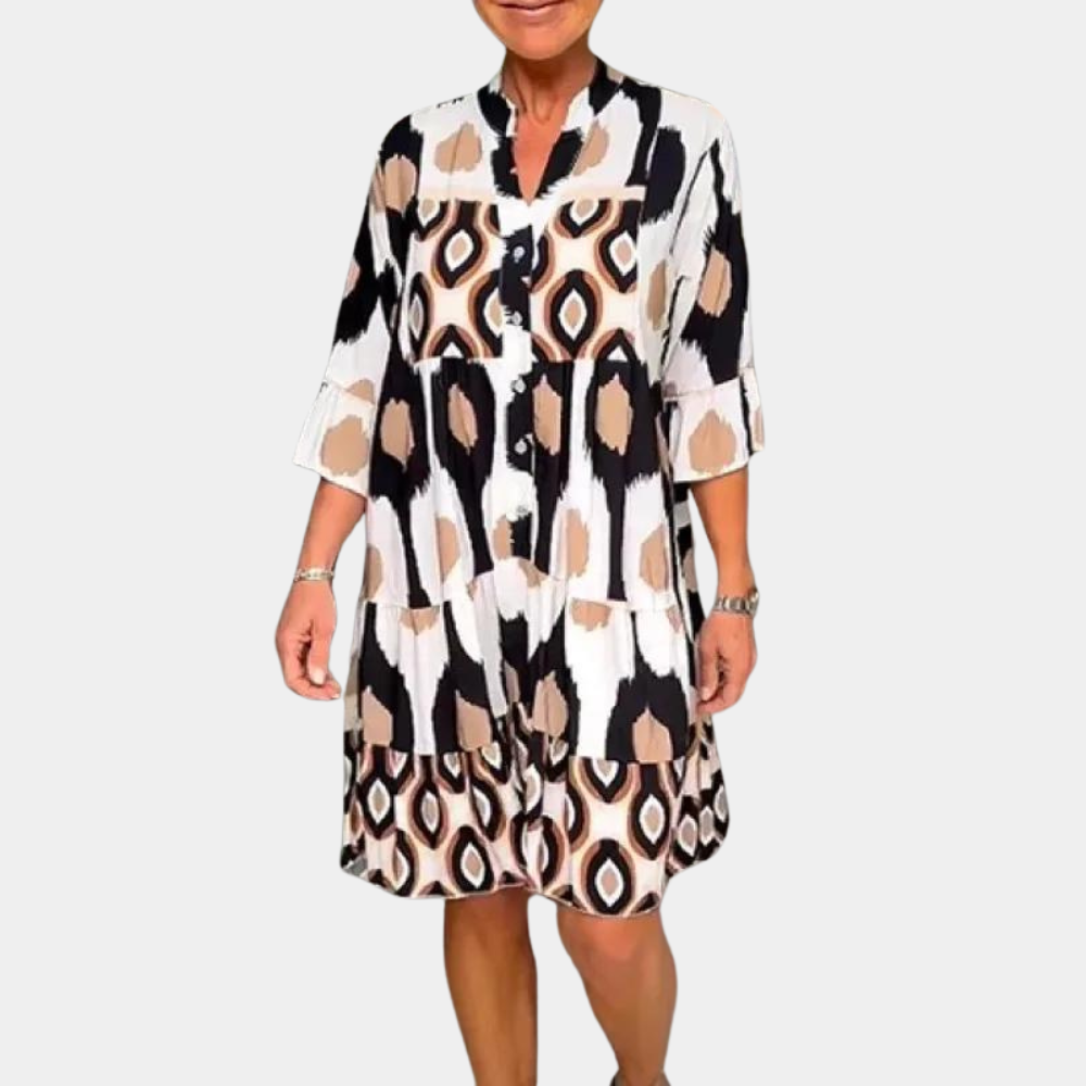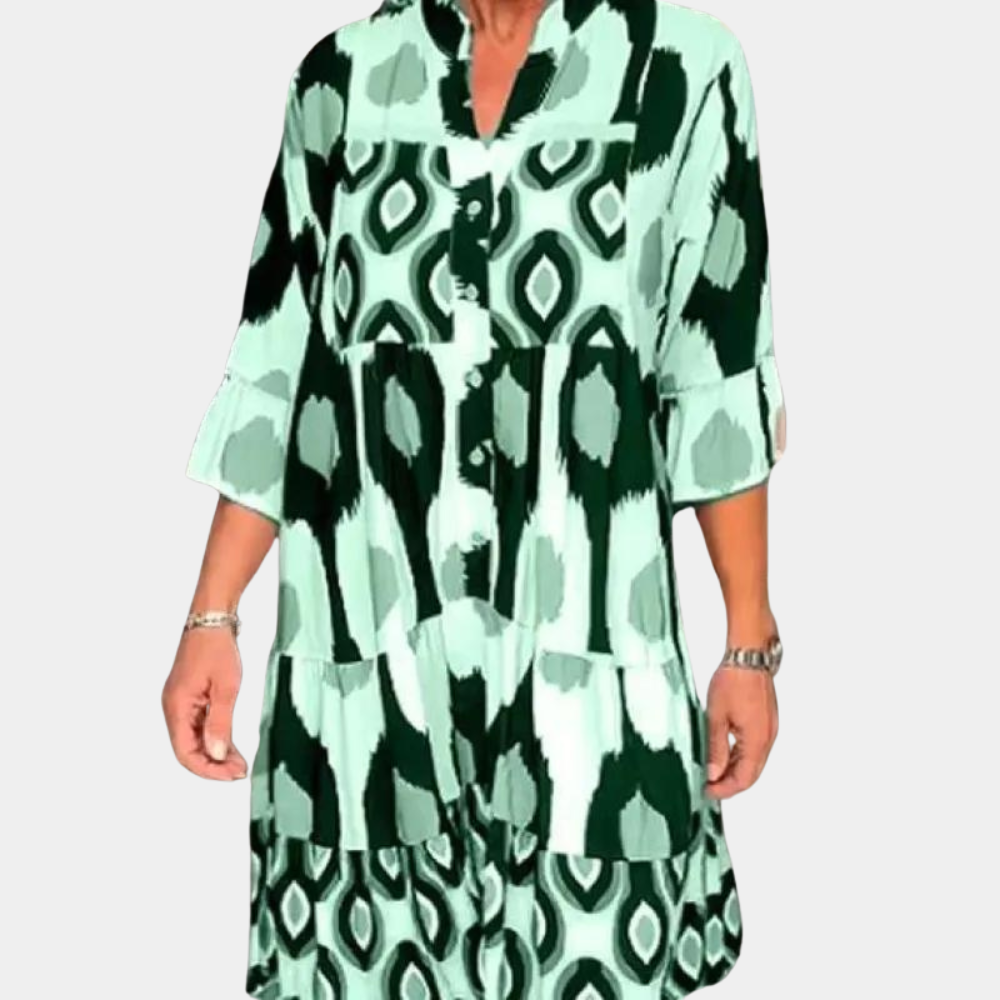 ✔ Detaljeret design: V-hals, 3/4-ærmer med en let flare og et smukt print, der gør kjolen unik og stilfuld.