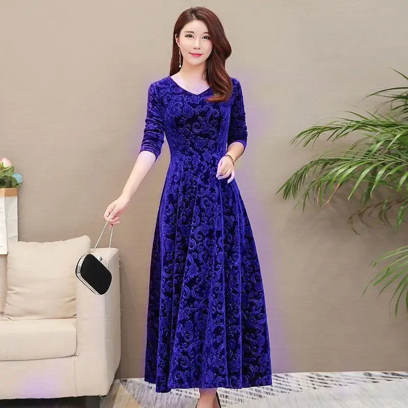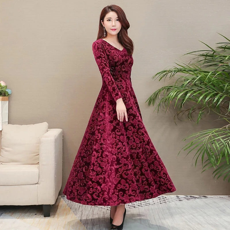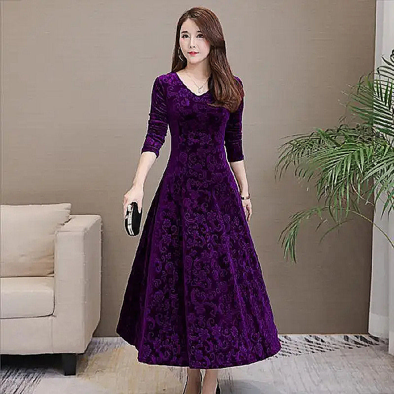 Stilfuld fløjlskjole med firkantet hals og blomstermønster til kvinder