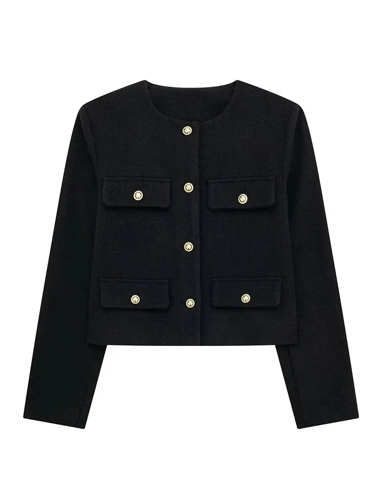 Med en kortere pasform og stilfulde knapper kombinerer denne blazer ubesværet med enhver outfit. Den alsidige stil gør den ideel til både forretnings- og afslappede begivenheder, mens det højkvalitetsmateriale sikrer komfort og holdbarhed.