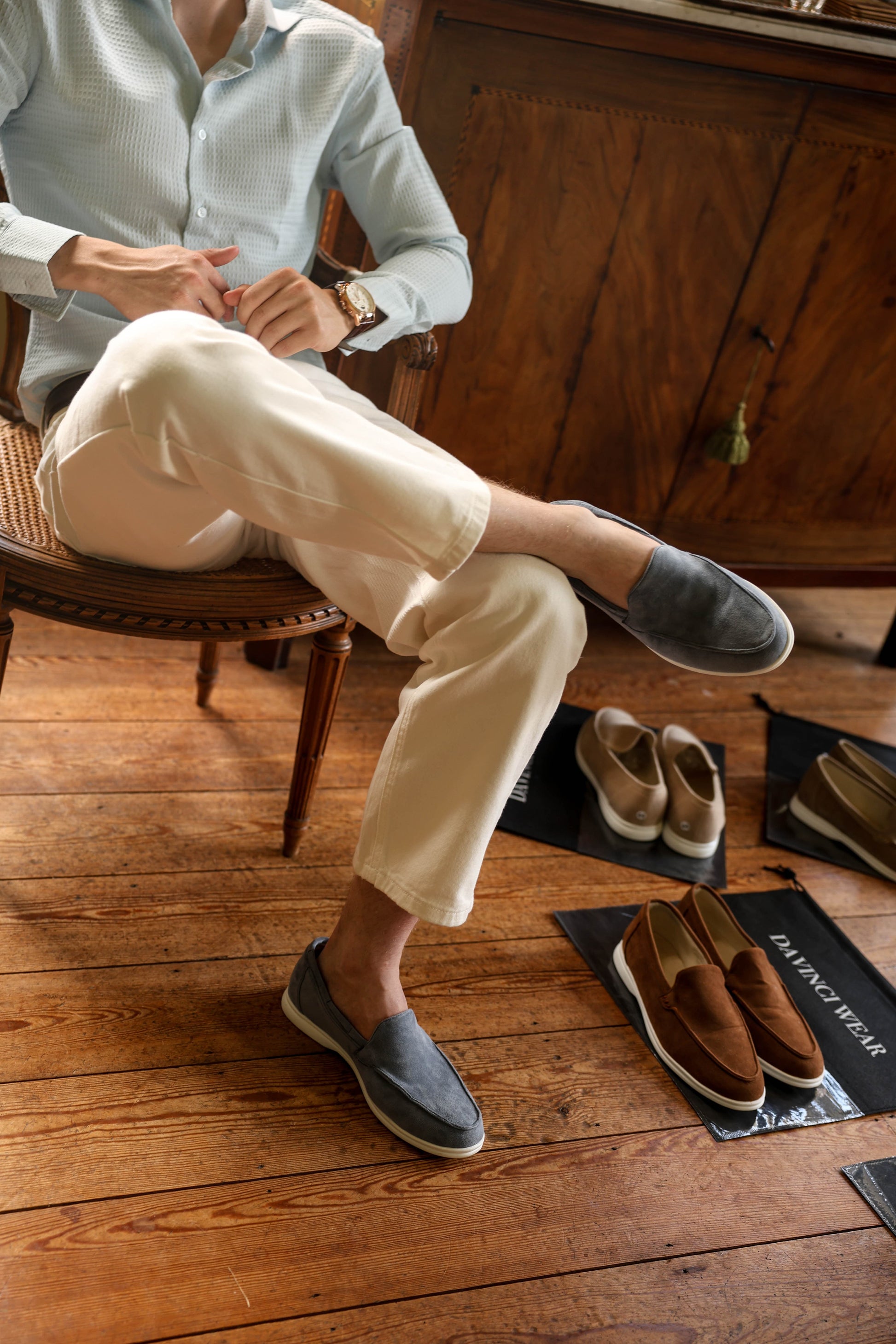 Oplev den perfekte kombination af raffinement og afslappet stil med vores Yacht Loafers i lyseblå. Disse loafers, fremstillet af førsteklasses ruskind, tilbyder en blød og luksuriøs følelse, der gør dem ideelle til sommerudflugter og afslappede begivenheder. Med et slankt slip-on design og en let gummisål, leverer de både komfort og holdbarhed, alt sammen med et strejf af nautisk flair.
