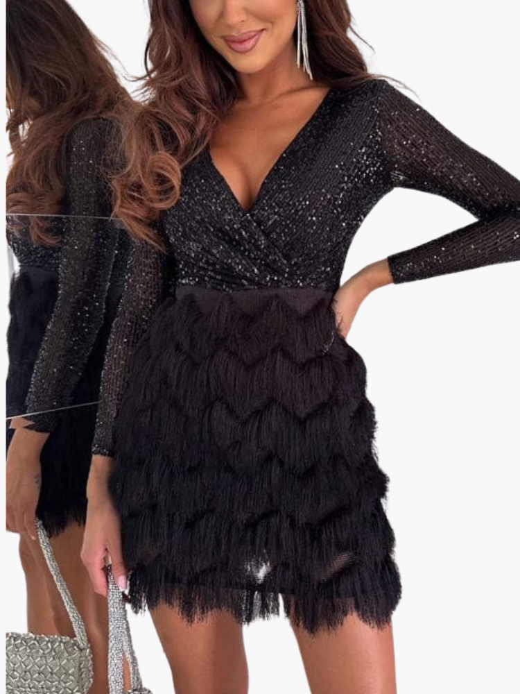 Denne pailletbesatte kjole med frynser i skørtet er en must-have til enhver kvinde, der elsker at gøre en indgang. Perfekt til at skabe uforglemmelige øjeblikke og føle sig fantastisk.