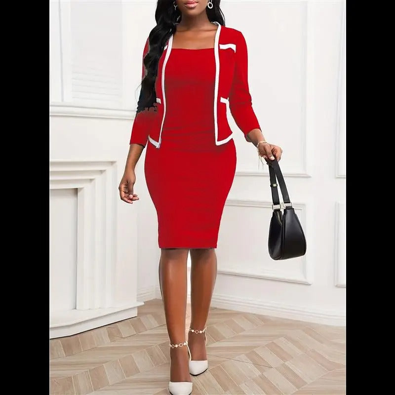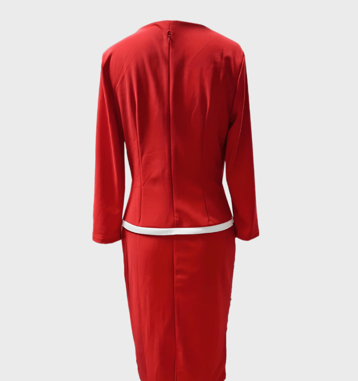 Tilføj et strejf af klassisk elegance til din garderobe med denne smukke røde blyantkjole med hvid kant. Perfekt til både formelle lejligheder og en sofistikeret hverdagsstil.