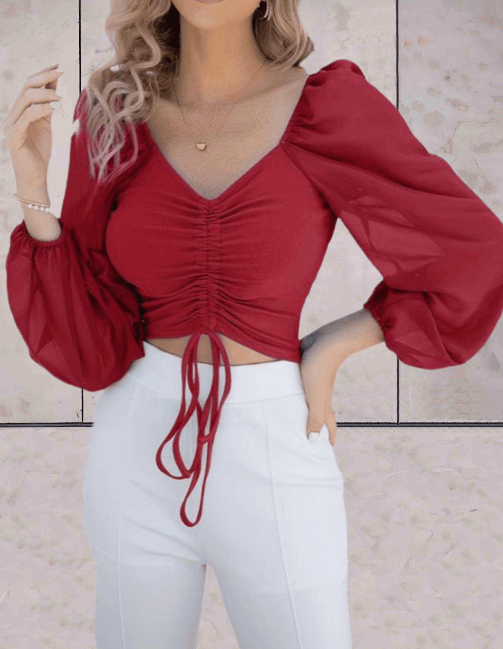 Tilføj et feminint touch til din garderobe med denne rød cropped bluse med rynker – ideel til både afslappede og festlige lejligheder!
