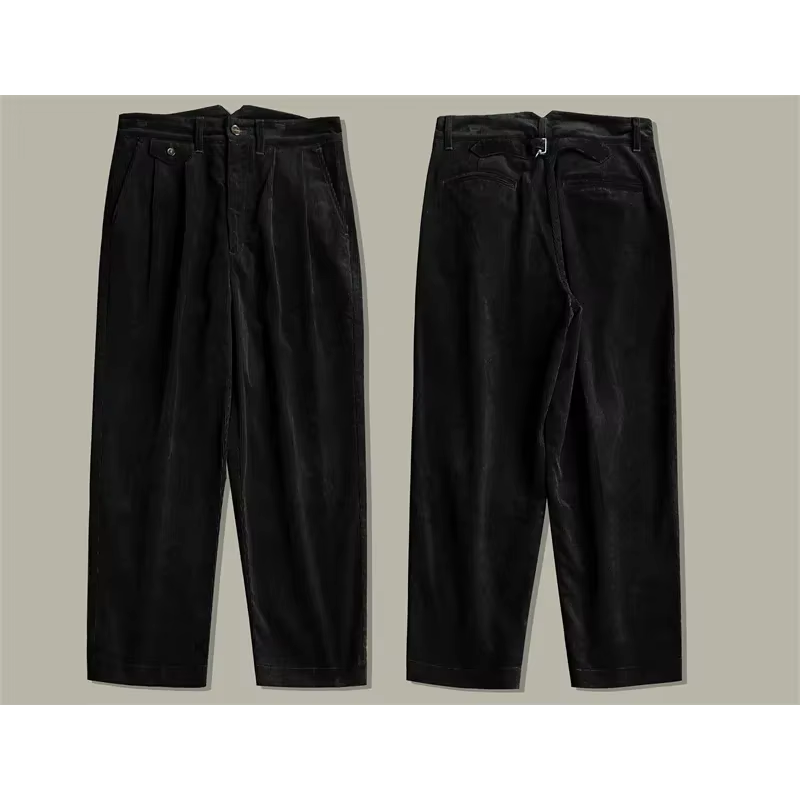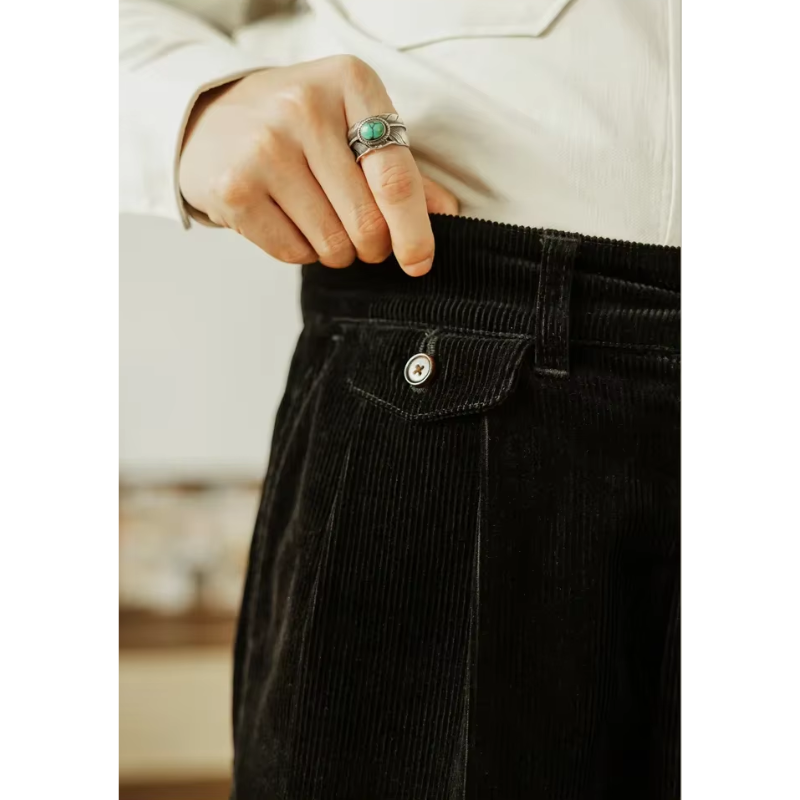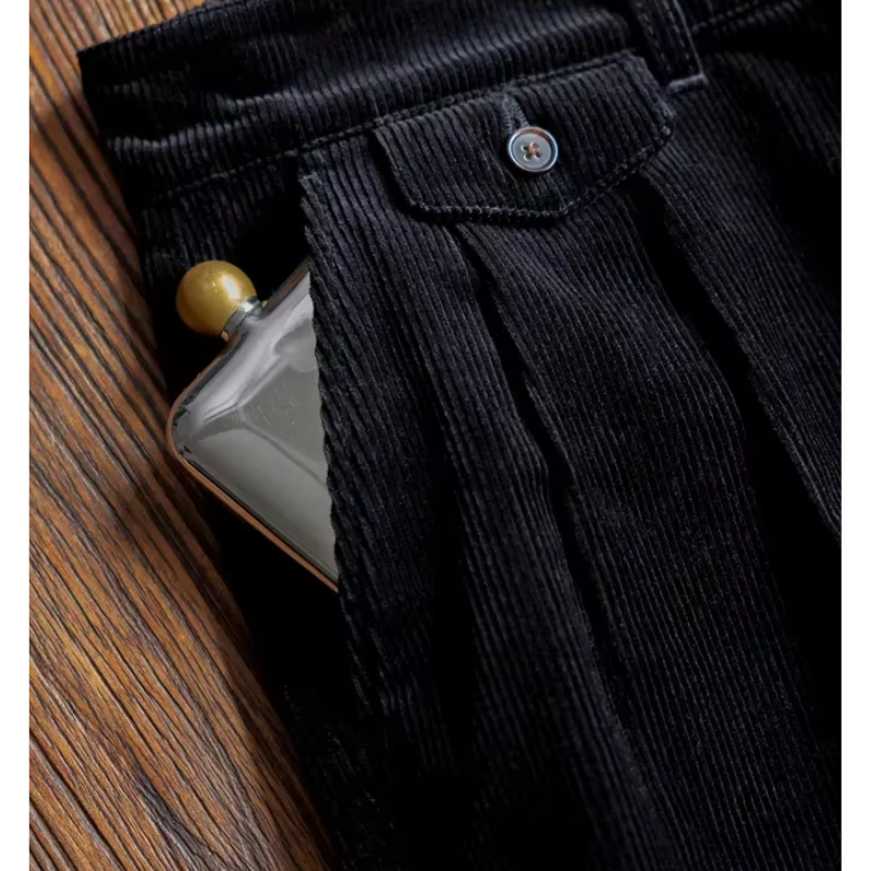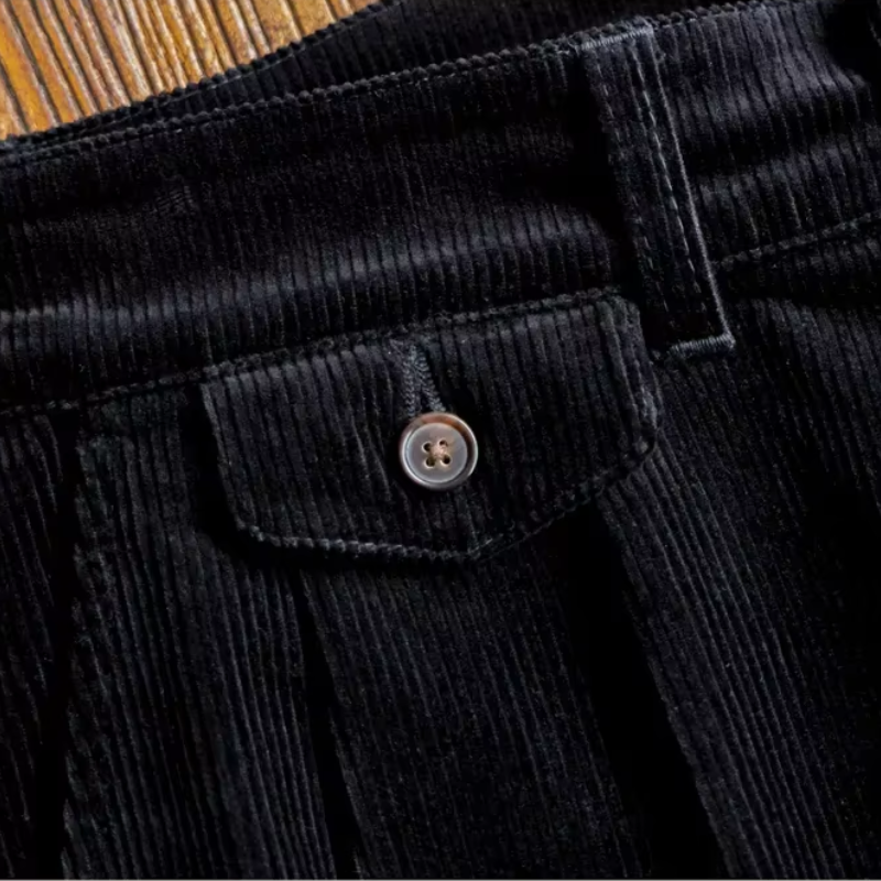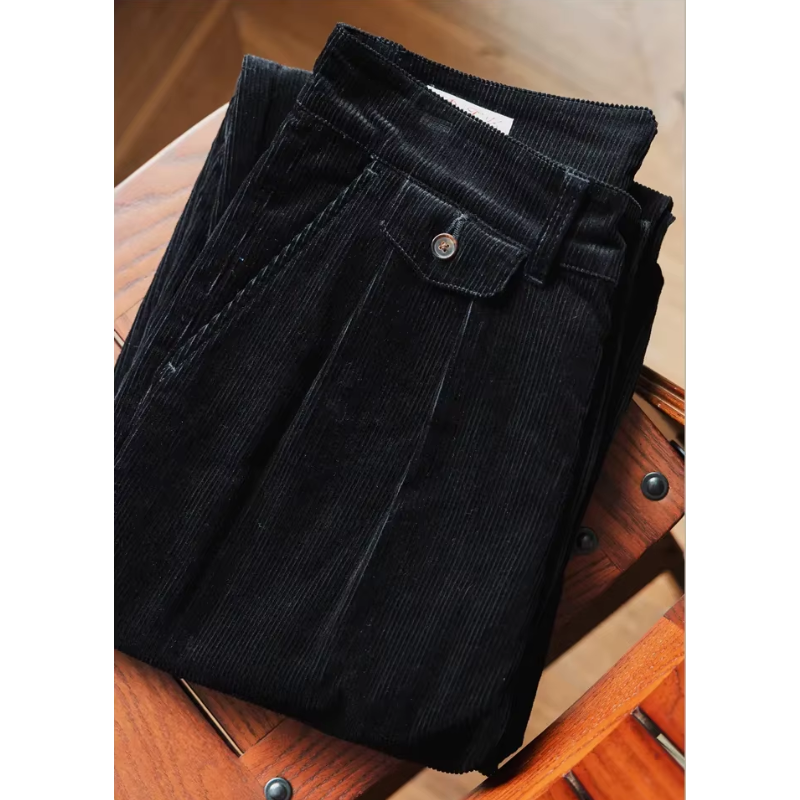 Denne sorte fløjlsbuks har gennemtænkte detaljer som dybe stiklommer og diskrete plisseringer, der tilføjer et strejf af raffinement til din daglige garderobe. Den rige sorte farve gør buksen alsidig og nem at matche med alt fra skarpe hvide skjorter til afslappede striktrøjer.