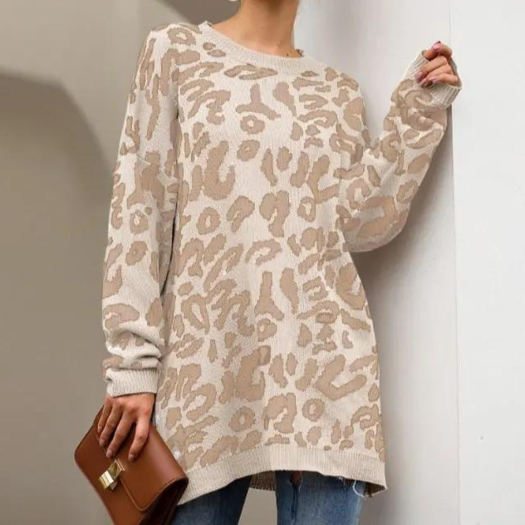 Strikket lang sweater med leopardprint til kvinder