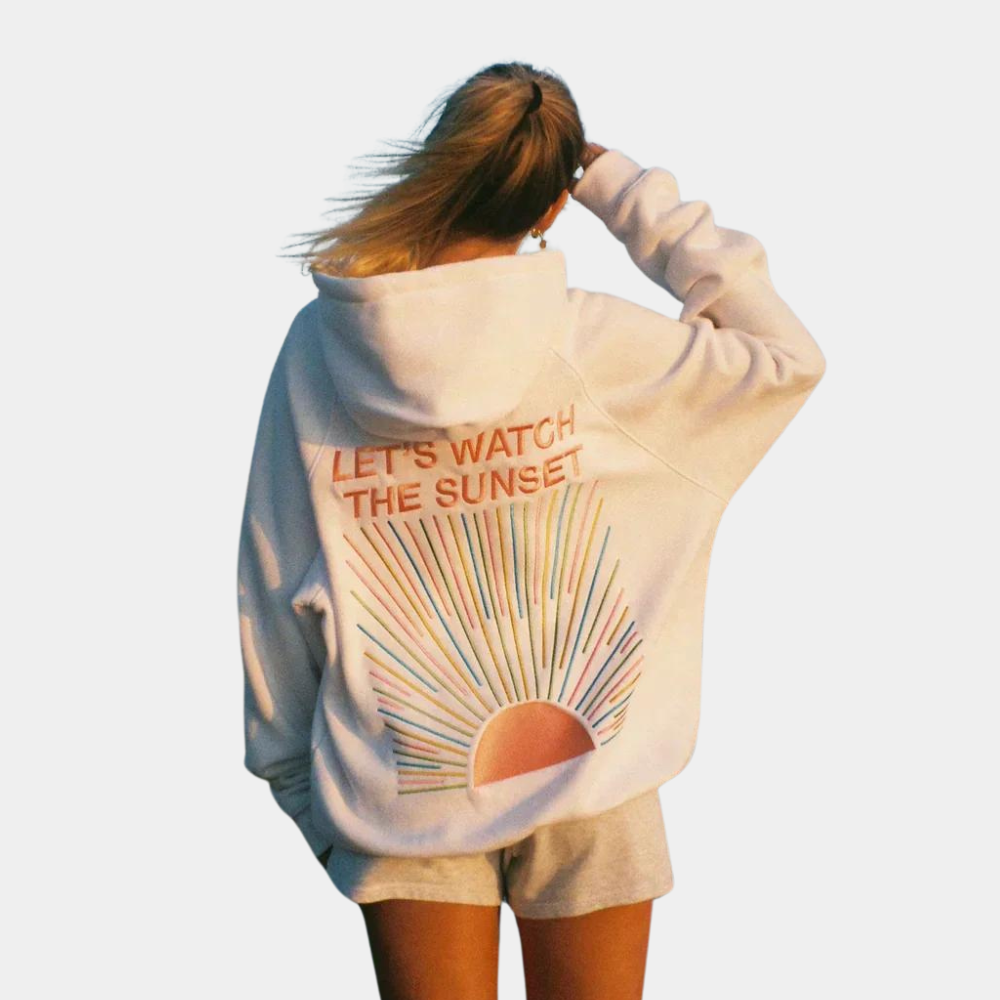 Denne hættetrøje er til kvinder, der elsker enkelhed med et strejf af naturlig skønhed. Inspireret af de varme nuancer og blide overgange, man ser ved solnedgang, bringer denne hættetrøje en rolig og stilfuld vibe til dit outfit. Med sin bløde, hvide base og subtile farvedetaljer er den perfekt til afslappede dage eller hyggeaftener.