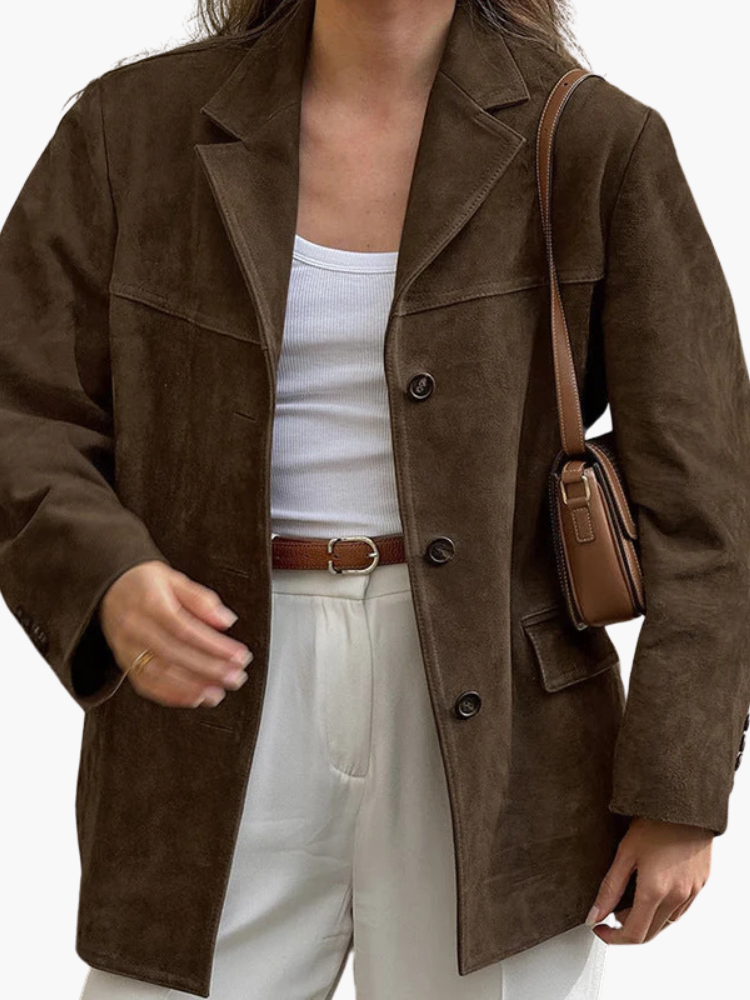 Denne vintage brune blazer i ruskindslæder er det perfekte valg til kvinder, der elsker unikke og elegante stykker. Gør den til en fast del af din garderobe, og lad den blive din nye favorit til enhver anledning.